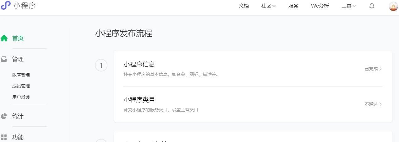 在小程序的首页--小程序发布流程--小程序信息为已完成,但当我点击小程序信息时会会弹出补充小程序基本信息,当我点击前往填写时,会返回到首页信息,就这样一直循环下去。