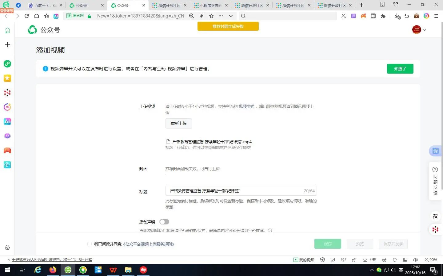 公众号后台上传视频无法自动生成封面,也无法手动上传。急急急需紧急解决