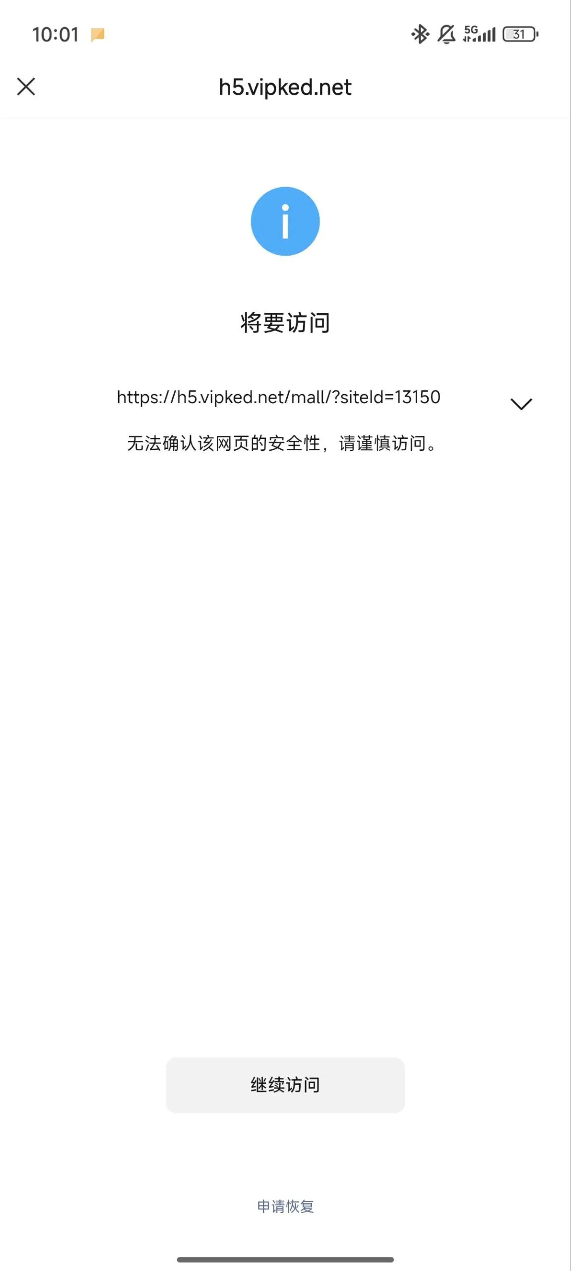 您好,域名:https://h5.vipked.net/mall/?siteId=13150这个是商品的展示链接,未包含任何不安全的内容,微信用户在访问该链接时提示:“无法确认该网页的安全性,请谨慎访问”,给用户造成了访问的疑惑,此链接已经在工信部备案完成,备案号:湘ICP备14015885号-8,诚恳的希望微信官方解除该链接的访问提示。非常感谢!