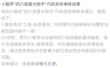 你好 我们最近提交的小程序:四六级查分助手,审核被拒。它的主要作用是帮助学生备份准考证,能否帮忙解决下,谢谢!