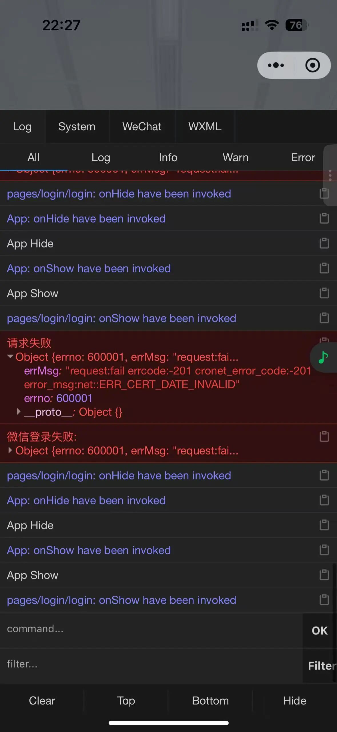 小程序无法登录,提示ERR_CERT_INVALID, 同一个域名另两个个小程序就可以,没有问题,这个小程序就报错!