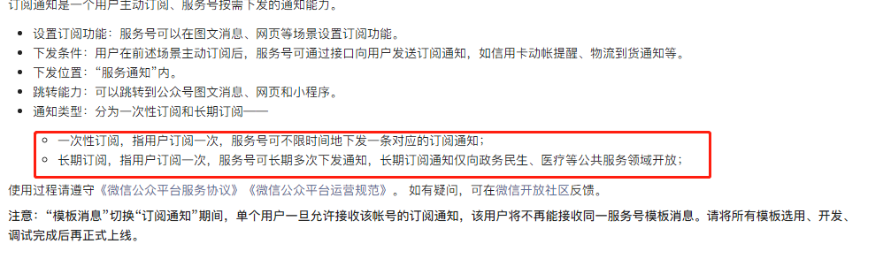 目前长期订阅通知面向政务民生、医疗、交通、金融、教育、运营商等公共服务领域开放。开通订阅通知后需先申请行业类目(部分类目需要提交资质审核),行业类目通过后,可以查看该行业类目下是否存在长期订阅模板。