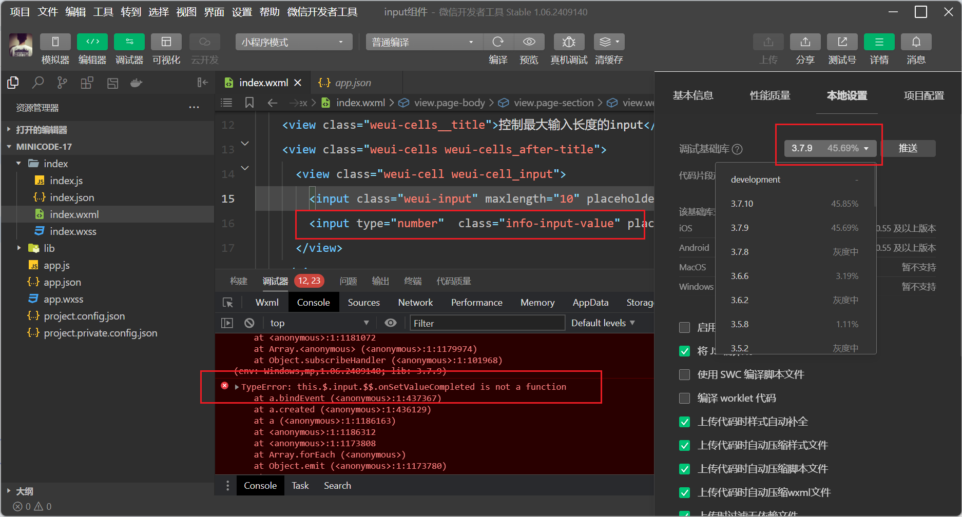 用的你们官方的案例代码片段《input 组件》,把调试基础库版本换成3.7.9,input组件会抛出异常,怎么解决呢?