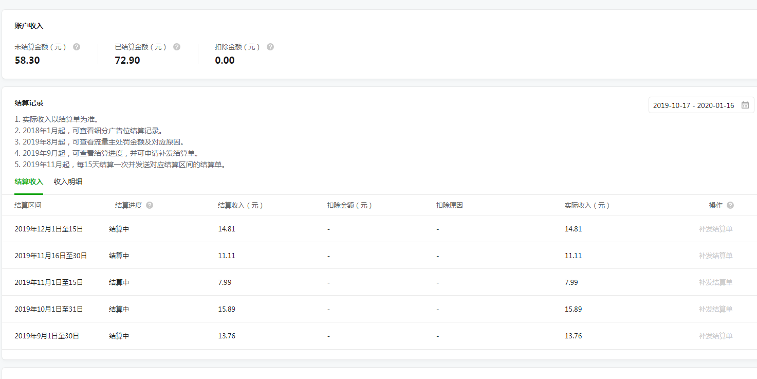核实该帐号没有及时补充财务,帐号是在2020.01月才补充的财务资料,2019.12月下半月开始才会有结算单(已下发至对应的结算邮箱),若前期有产生收益,后续我司会统一处理补结的。补结与正常结算的流程是不一样的,补结流程涉及的程序较多,时间较长,补结成功后会下发结算单至对应的结算邮箱的,还请耐心等待后续留意。