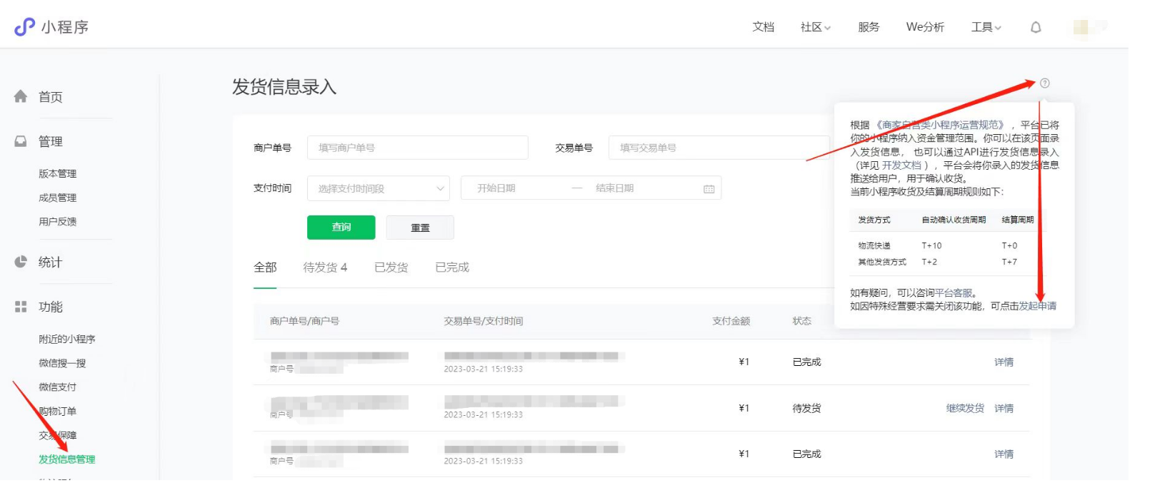 2、服务商测试号/商家申请订单发货管理功能: