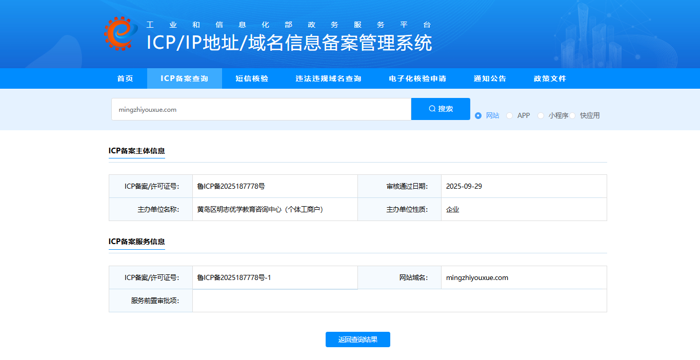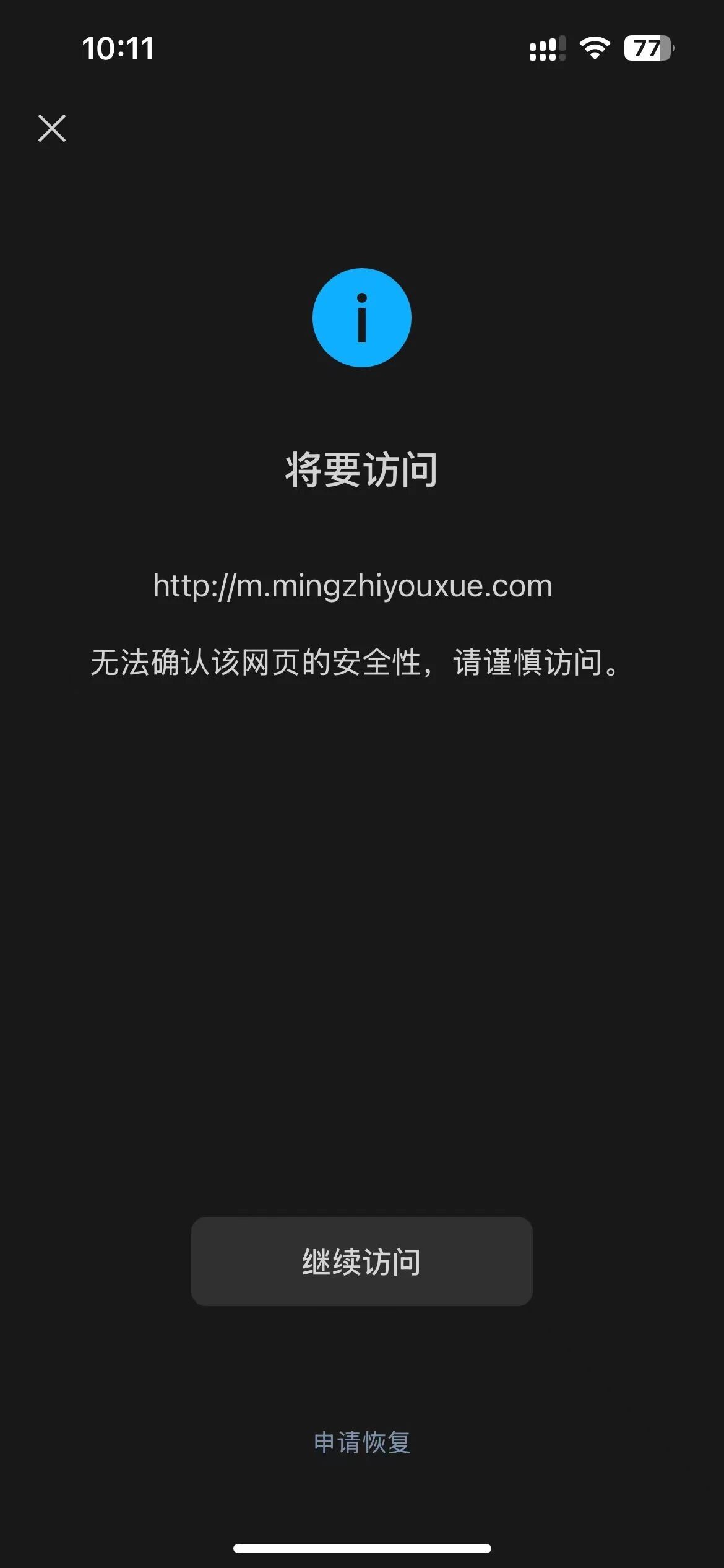 您好,域名m.mingzhiyouxue.com在西部数码注册并通过优刻得备案通过,http://m.mingzhiyouxue.com/浏览器访问正常,我是网站开发者,访问时间如图2025/10/9,点开网址提示“无法确认该网页的安全性,请谨慎访问。”经检查网页里没有不安全的内容,请核实后帮忙解除拦截,谢谢!尽快处理,急急急,现在需要打开使用,谢谢啦