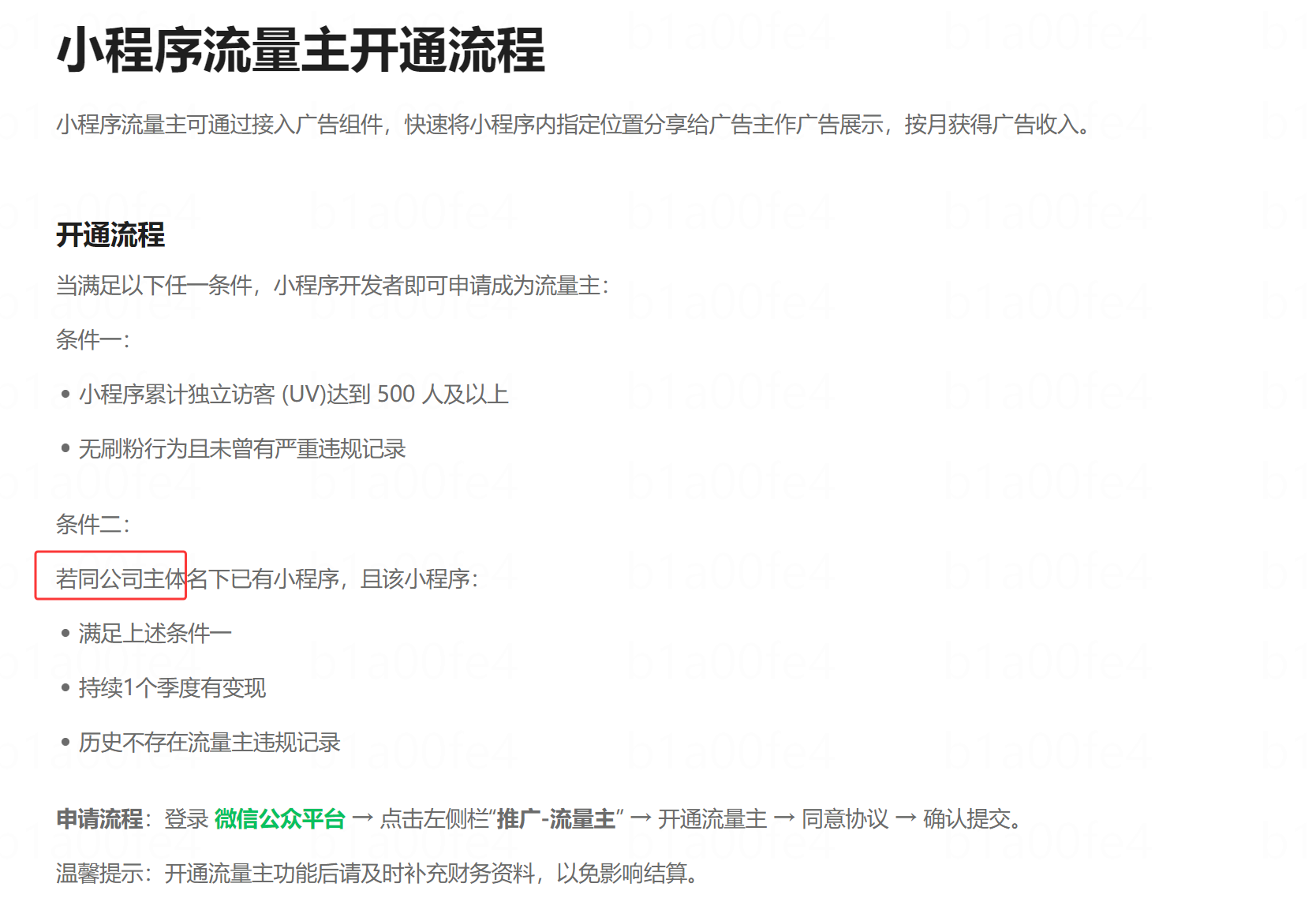 第一个小程序累计独立访客(UV)> 500,且从昨日开始持续1个季度(3个月)有变现(即持续有广告收入),且无流量主违规记录。