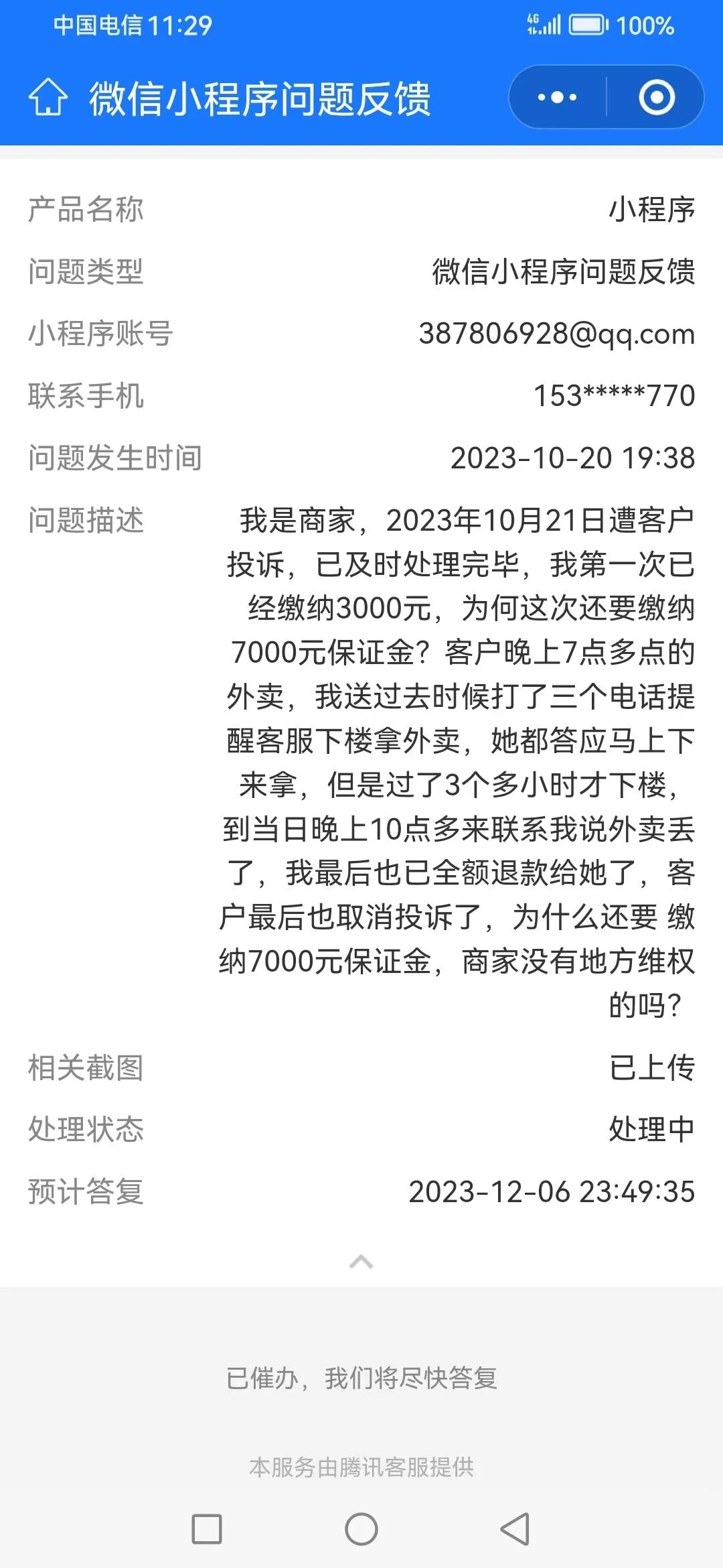 基本上事情的全经过就是:我们是开在学校的店,会送外卖,这个同学晚上7点多点的外卖,晚上10点多联系我说下楼没看到,跟我本人沟通也是满口的不讲道理,没有素质,最后我已全额退款给她,因为她的投诉导致我的需要缴纳7000元保证金,小程序才能继续让我用下去?,实在没有办法 才来求助的,请问商家没有地方维权申诉的吗? 碰到无理买家只能忍气吞声的吗?