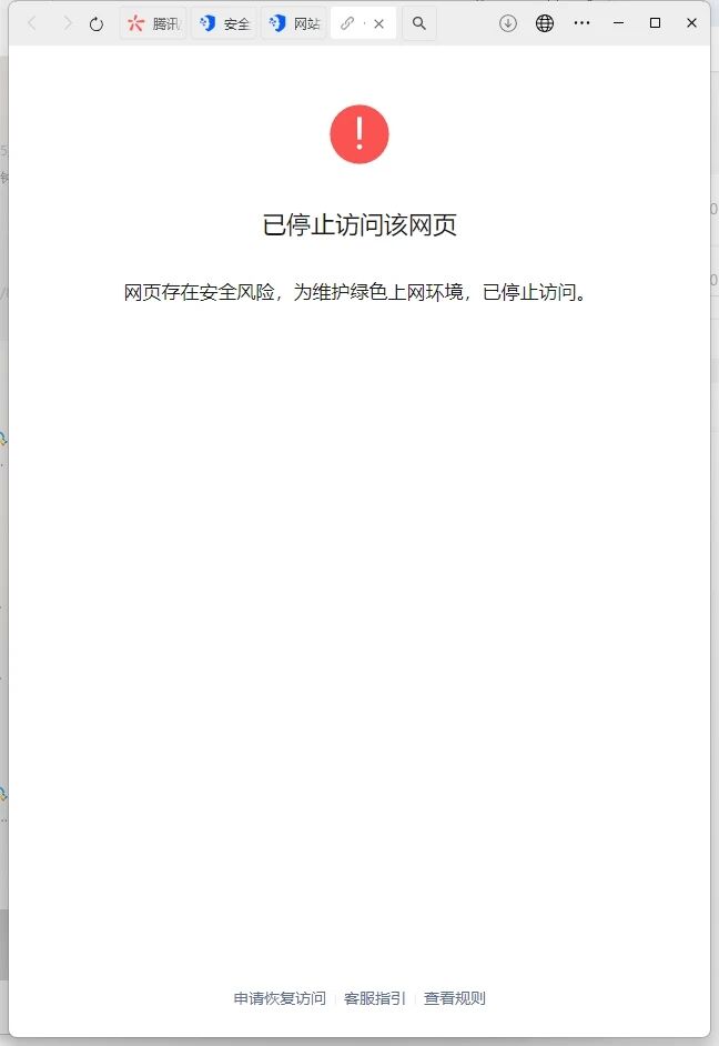 但是微信打开就是显示,网页存在安全风险,为维护绿色上网环境,已停止访问。解除拦截恢复可直接在微信内访问该网站谢谢审核大人.
