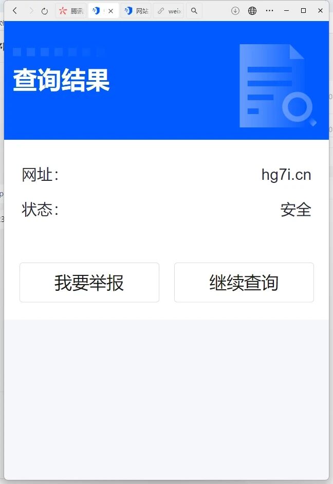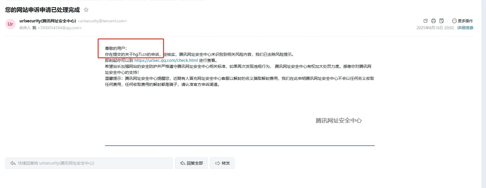 也使用了「腾讯安全-网址安全中心[6]」对网站域名进行检测,显示的是域名安全,但是就是显示已停止访问,这个大大影响了我,麻烦审核大人解封一下,恢复一下微信内可直接访问该域名服务谢谢。