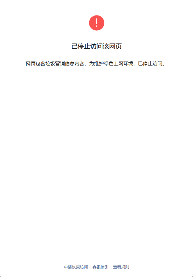 在微信直接点击链接显示“网页包含垃圾营销信息内容,为维护绿色上网环境,已停止访问。"如何处理?收到这个提示后马上仔细排查网站所有内容及代码,均未发现任何安全异常行为,麻烦帮忙审查给于解除提示,恢复正常,谢谢。