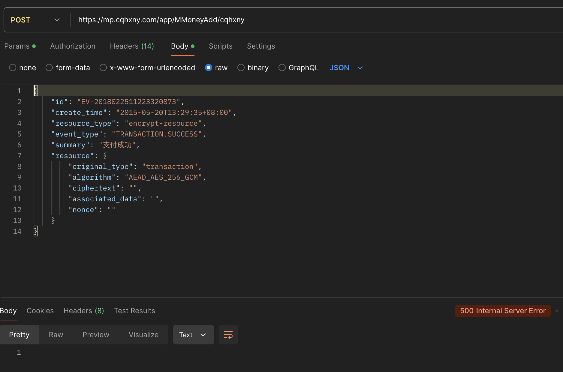 {"appid":"wxe971ef47fe35bd9e","mchid":"1696200158","description":"\u4F59\u989D\u5145\u503C","out_trade_no":"6a9775c3-d1b3a337","notify_url":"https://mp.cqhxny.com/app/MMoneyAdd/cqhxny","amount":{"total":10,"currency":"CNY"},"payer":{"openid":"oZm-I7R_QQdSpg1SeHqKyivavuzQ"}}