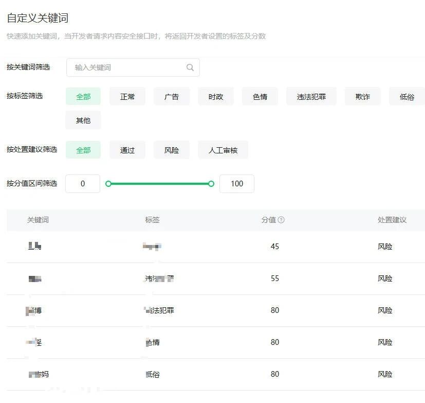 你好,不是的,自定义关键词是对接口的补充,若业务有特殊需求可进行添加,正常接入接口后,接口有自带的策略去进行违规识别的哈。