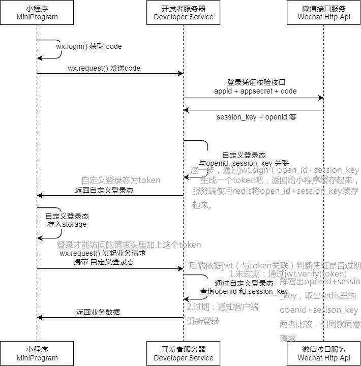 我想的是这样:首次进到小程序页面,wx.login()发送code到我们的后端,我们的后端发送请求到微信服务端获取openid和session_key,我们的后端使用redis缓存openid+session_key的值,并将openid+session_key的值通过jwt处理返回给前端缓存起来(服务端设置过期时间2h),以后前端需要登录的请求头里带上这个值到服务端判断是否是登录状态。两种情况:1.如果过期的话,后端经过jwt会自动返回登录已过期的回复,然后前端重新登录更新后端的openid和session_key。2.未过期,从request的头里取出发送给客户端的值(通过jwt生成的,也是服务端用来判断是否是登陆状态的依据),这个值通过jwt解密,将解密出的值与redis里的值比较,1.相同的话证明是合法登录,可进行后续操作 2.解密出空值或者两者不同的话,话证明不是合法的登录。