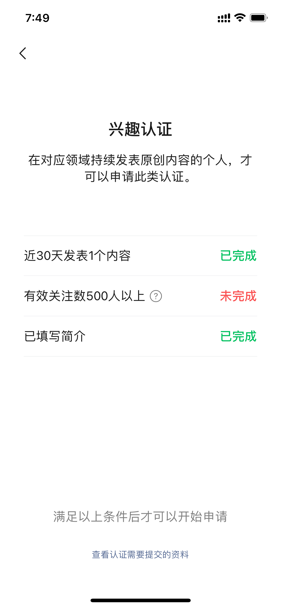 需要满足所有的申请条件(有效关注达到500),才会出现兴趣认证入口。建议再积累下有效粉丝: