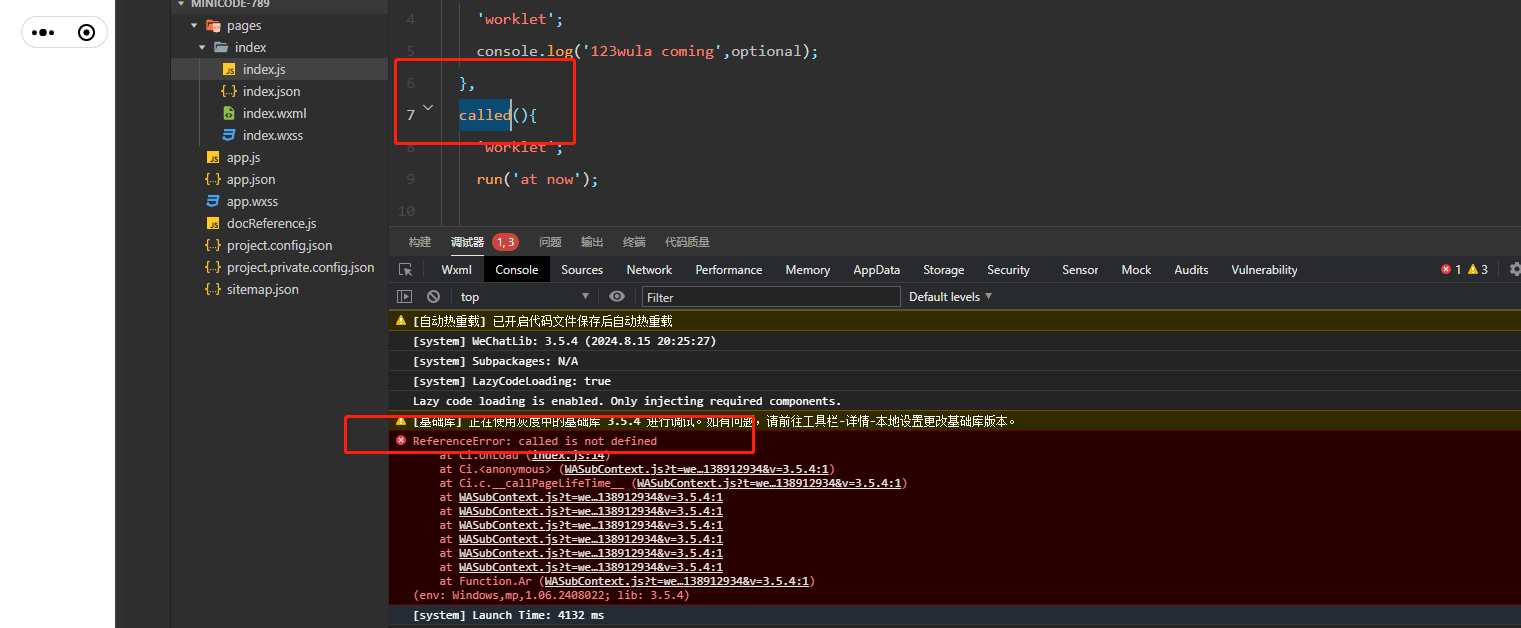 //文档代码const name = 'skyline'function anotherWorklet() {'worklet';return 'hello ' + name;}// worklet 函数间可互相调用function someWorklet() {'worklet';const greeting = anotherWorklet();console.log('another worklet says ', greeting);}wx.worklet.runOnUI(someWorklet)() // print: [ui] another worklet says hello skyline//按照文档修改再次报错:run(optional){'worklet';console.log('123wula coming',optional);},called(){'worklet';run('at now');},onLoad(res){wx.worklet.runOnUI(called)();}//ReferenceError: called is not defined代码片段