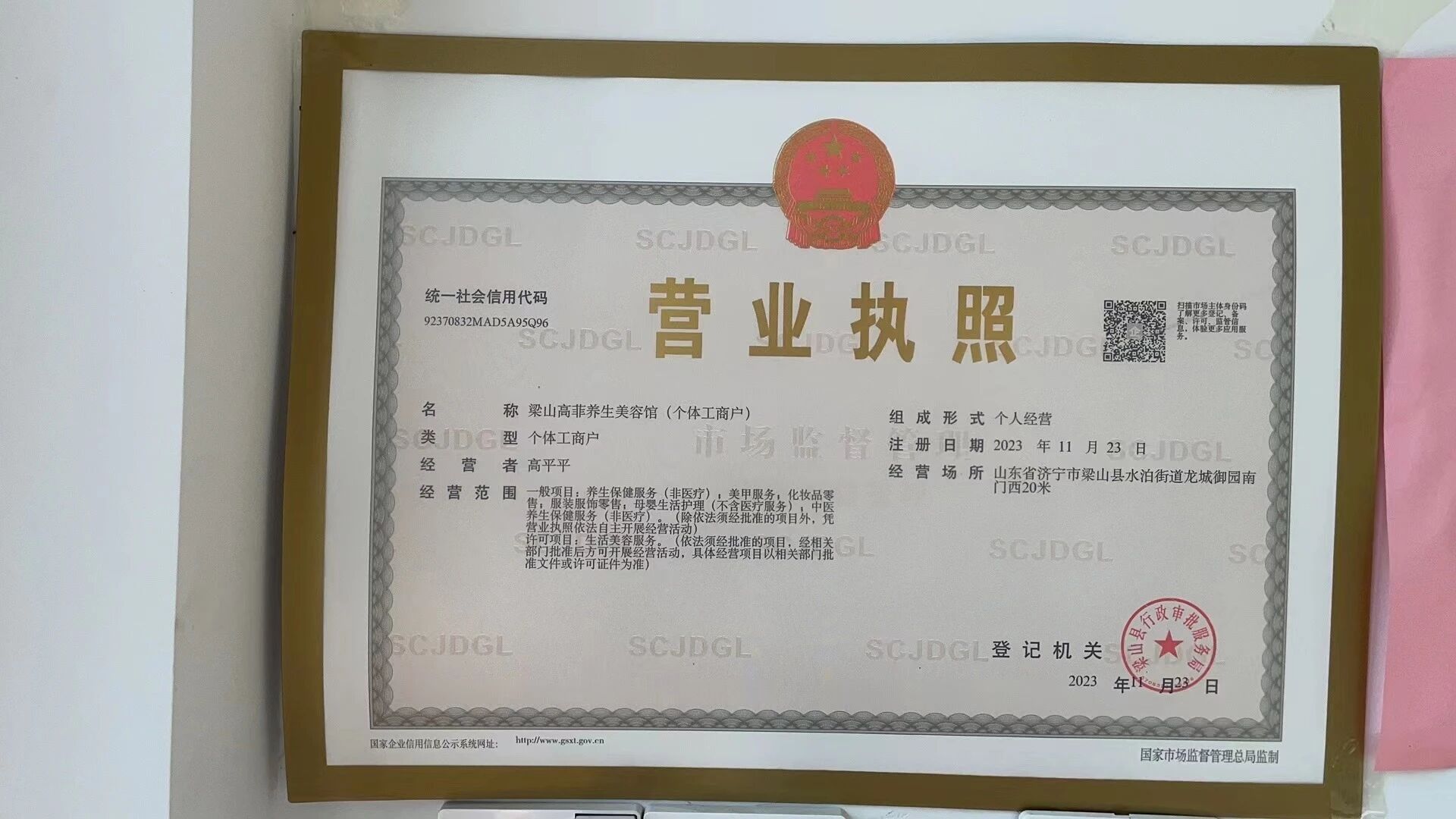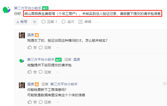 你好,梁山高菲养生美容馆(个体工商户),未核实到法人验证记录,请自查下提交的请求包信息