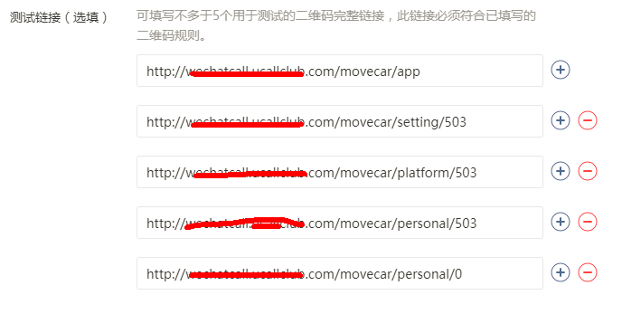 配置如上,用草料生成上面的测试连接,老是显示小程序未发布,此时测试范围为线上,若是我的小程序发布了,只能这5个测试连接生成的二位有效吗?若是用符合规则的其他链接如【http://.......com/movercar/personal/1000】生成的二维码就不行了吗?