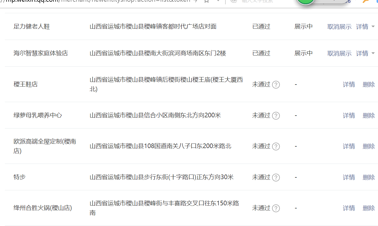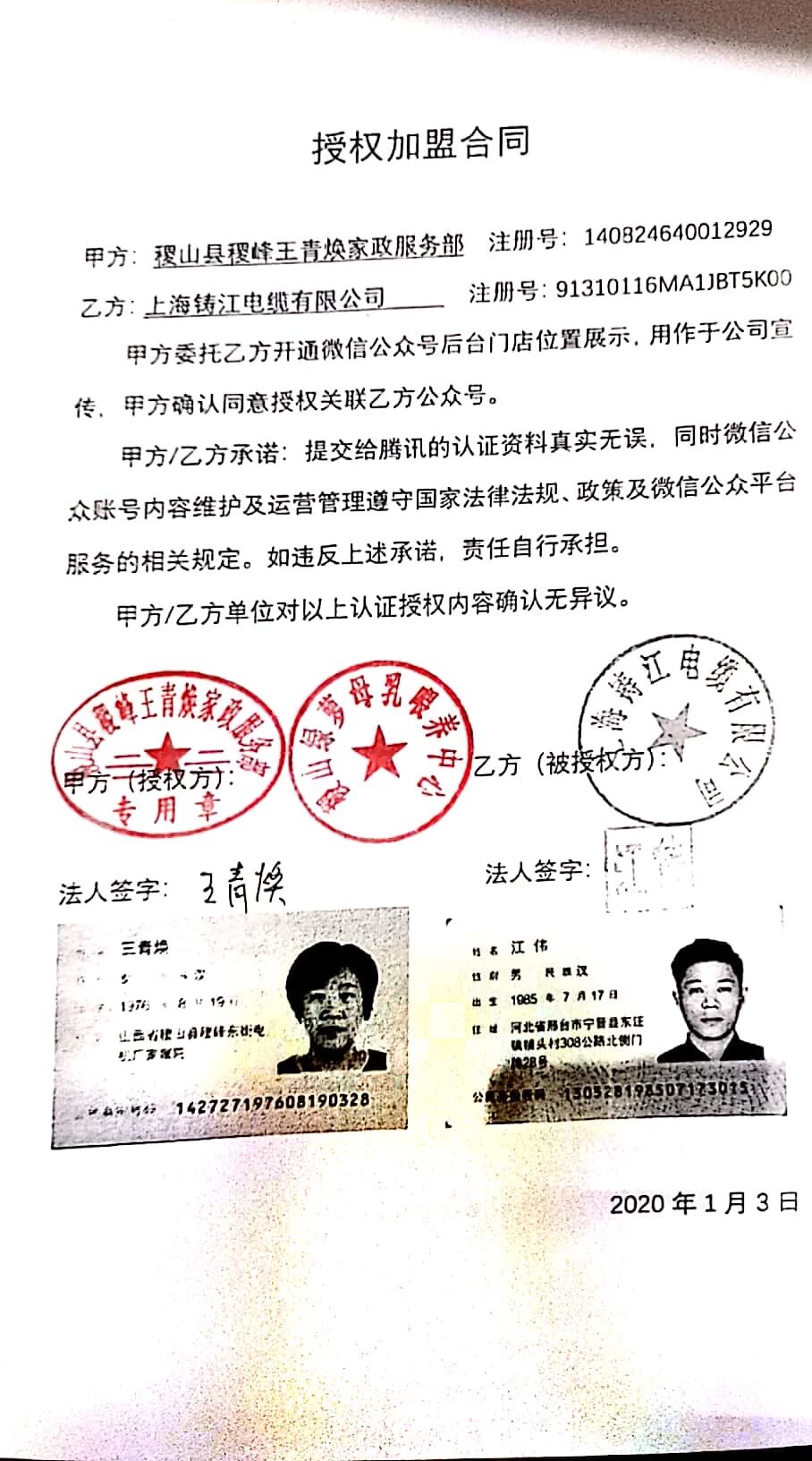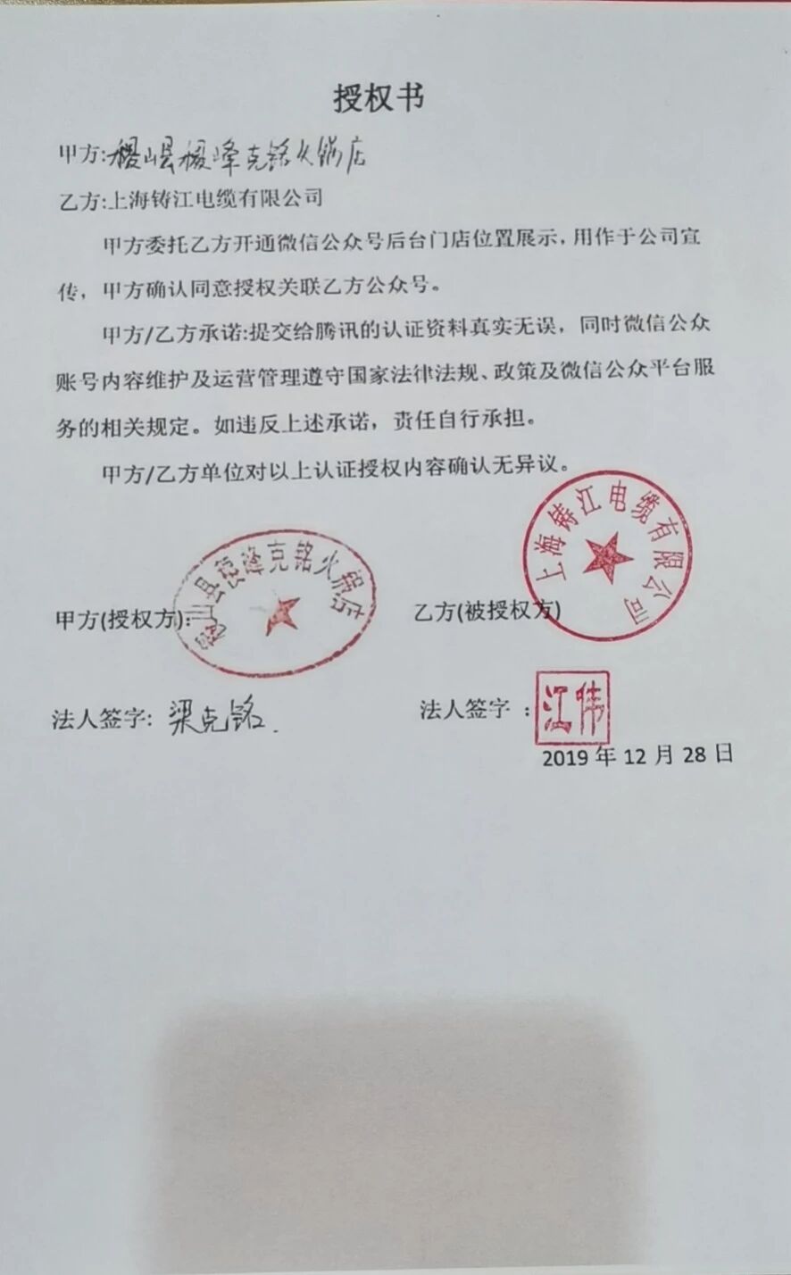 你好,由于贵司申请的各个门店的资质主体与账号主体:上海铸江电缆有限公司不一致,请参考《门店小程序使用指南》:http://kf.qq.com/faq/170426euiEzA170426FFfMnU.html 需要在申请门店小程序时选择“相关主体”,填写相关主体的经营资质名称和证件号,并提交对应的线下门店与账号主体的相关性证明材料申请门店审核。合同需含双方名称、双方的统一社会信用代码、双方公章或法人签名并提供身份证件。2)可提交的证明材料种类,在链接内的“如何证明地点的经营主体跟公众号或小程序帐号主体相关”有表格列出: http://kf.qq.com/faq/170401MbUnim17040122m2qY.html 若属于商标授权关系,请提交商标注册证以及商标授权协议等;若属于总公司和分支机构,请提交分支机构协议等;如果是属于加盟关系,建议用提供加盟协议证明材料。