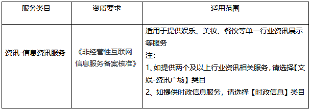 【资讯-信息资讯服务】类目:适用于提供娱乐、美妆、餐饮等单一行业资讯展示服务。