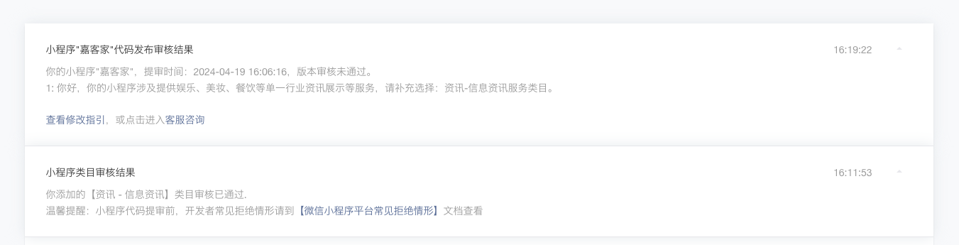 代码审核环节,将会对小程序运营的内容与所选类目是否相符进行核实,当小程序涉及提供娱乐、美妆、餐饮等单一行业资讯展示等服务,需要补充【资讯-信息资讯服务】类目合规提审,否则代码审核环节将面临因类目不符被驳回情形。