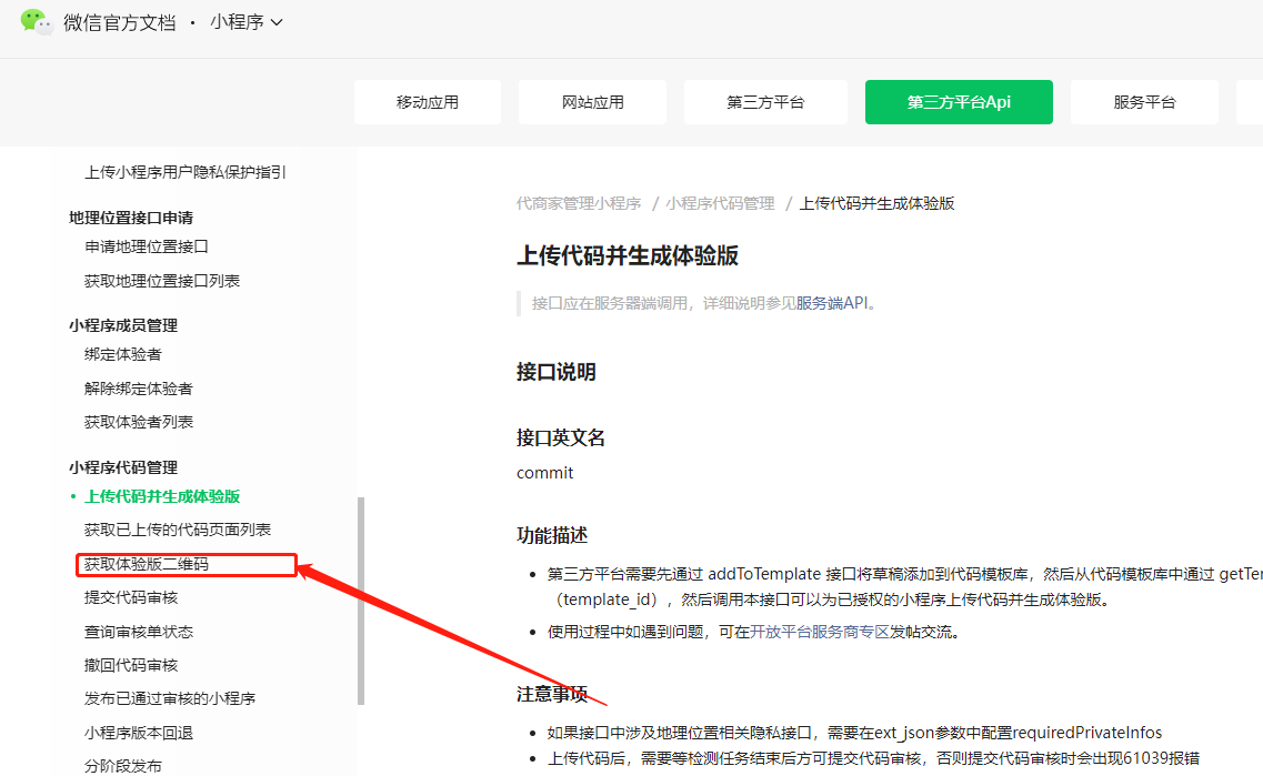 这个 https://developers.weixin.qq.com/doc/oplatform/openApi/OpenApiDoc/miniprogram-management/code-management/getTrialQRCode.html