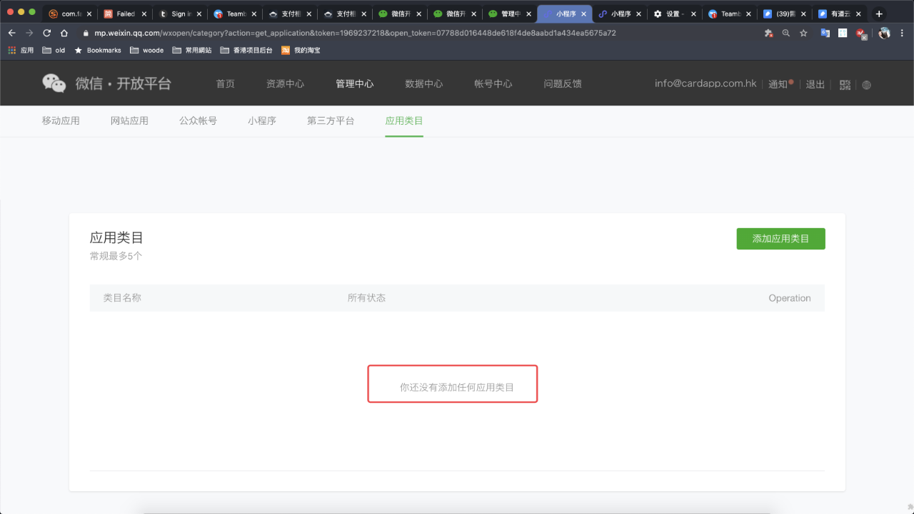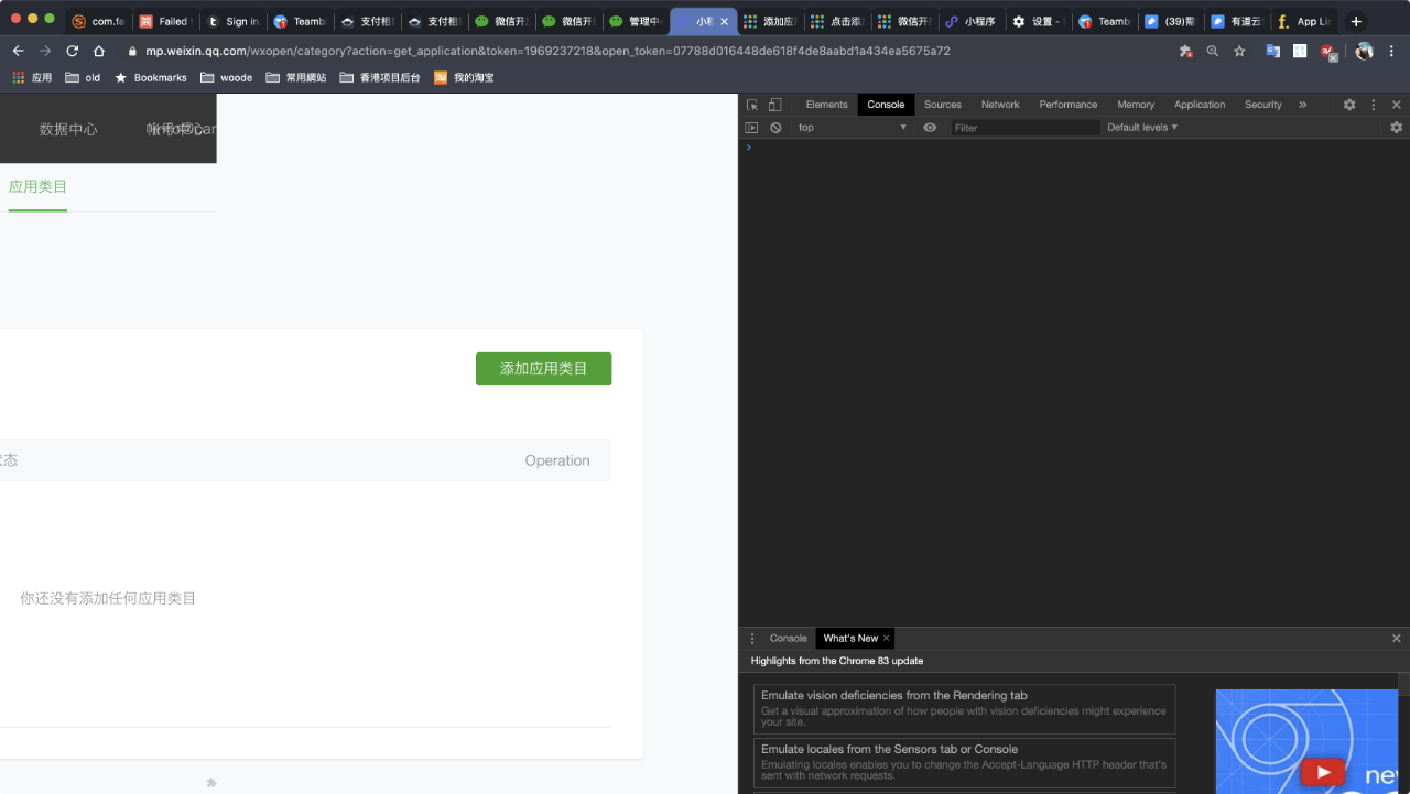 但是点击修改,到了应用类目这里点击申请, 之后跳转到添加应用类目那里,点击无反应,更换电脑也是不行,请帮忙解决下,非常感谢