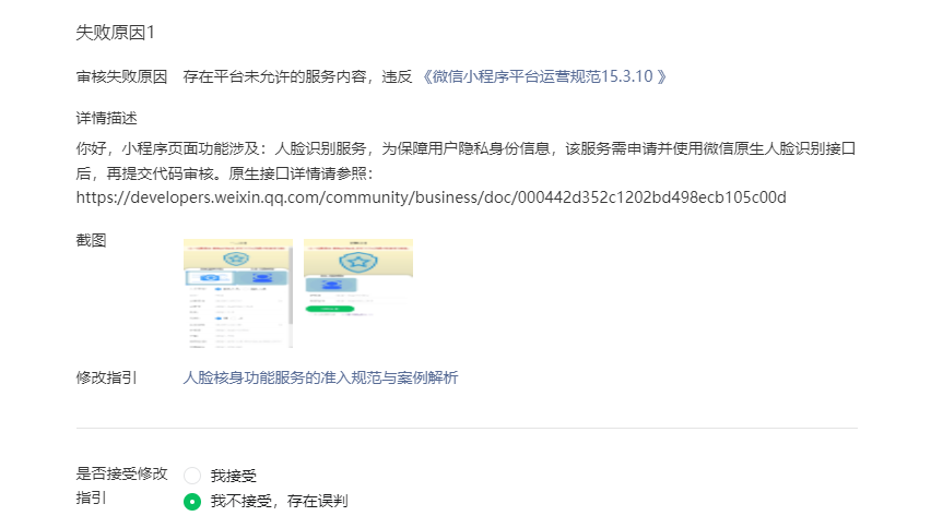 你好,经核实,小程序最新版本已提供录屏协助审核,暂未涉及人脸识别,审核已于2024-09-03通过,后续审核将以实际提交的小程序服务内容为准。