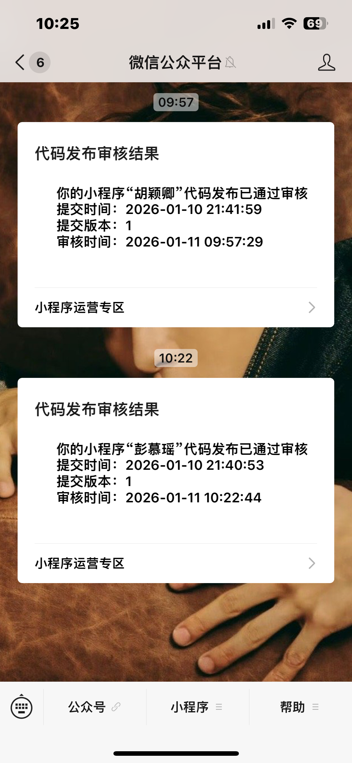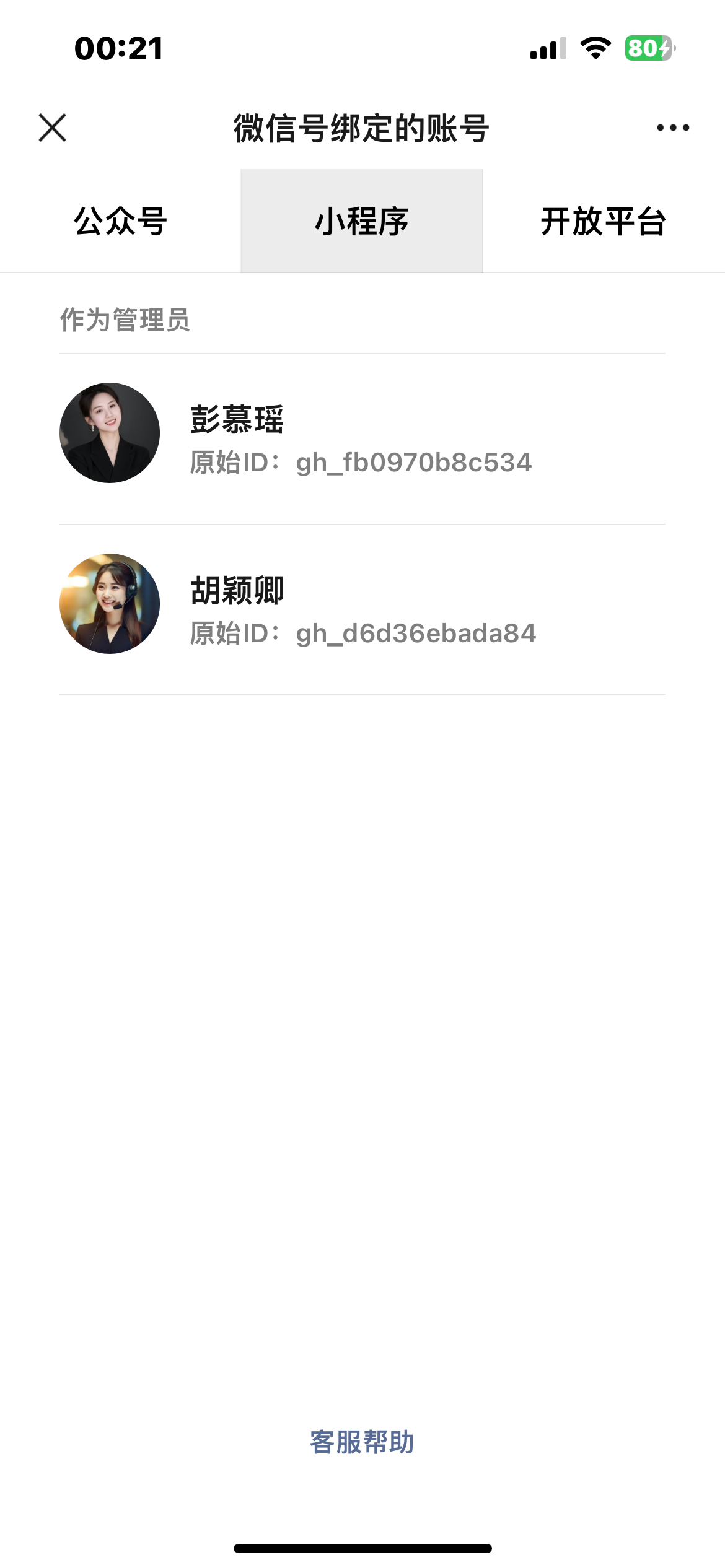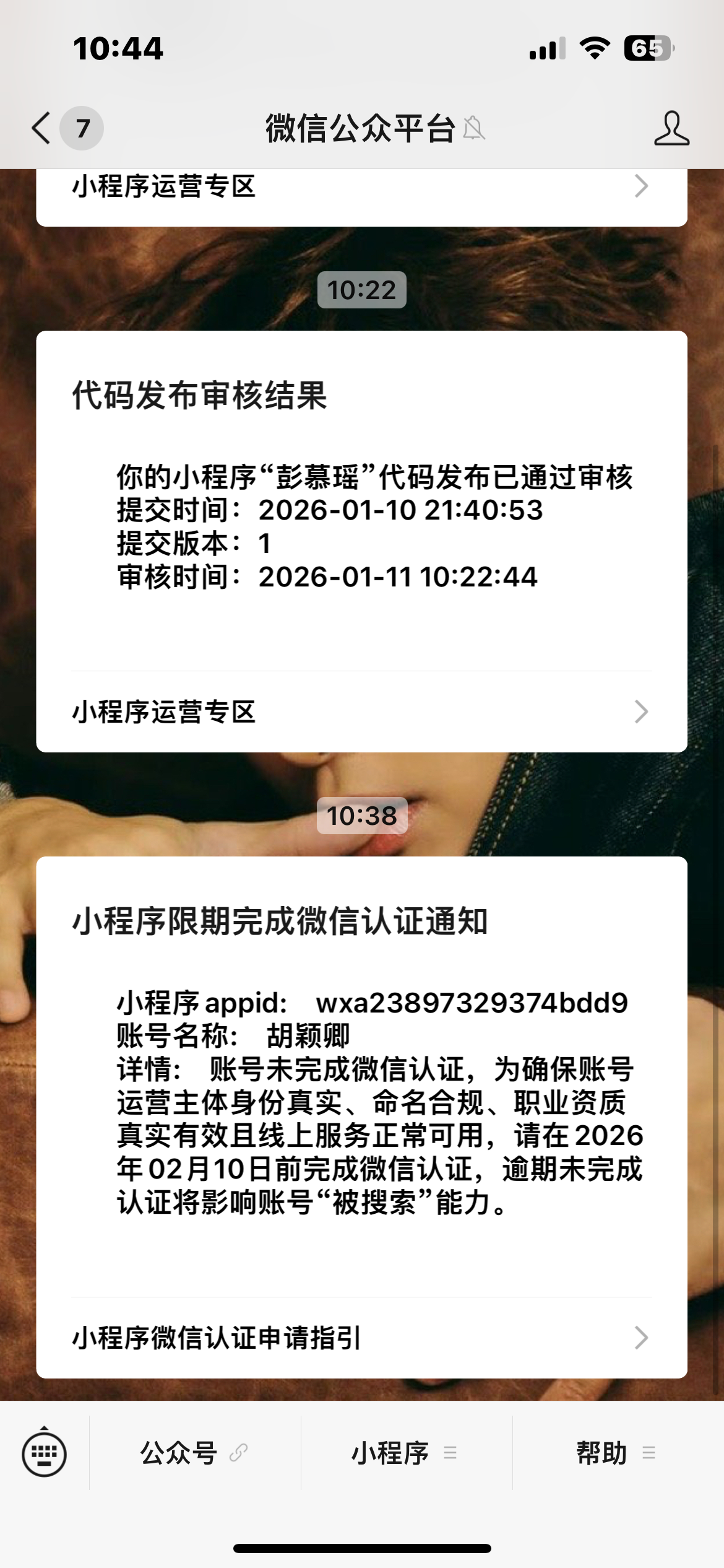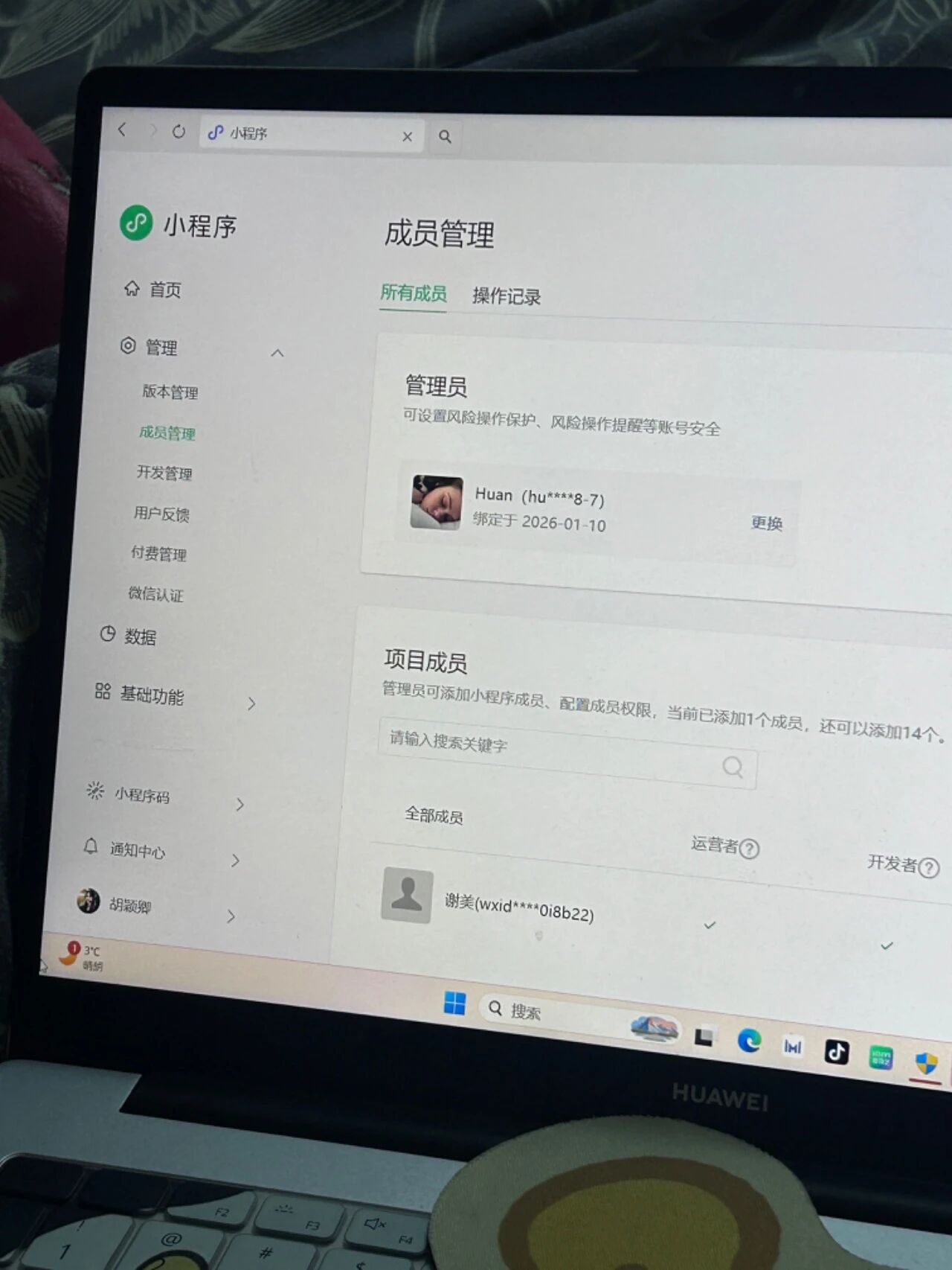 本人Huan,为该小程序被冒名绑定的管理员,从未主动注册/绑定该小程序,也未参与“胡颖卿”“彭慕瑶”小程序的开发、发布操作(两小程序于2026-01-10提交代码,2026-01-11通过审核)。后台出现陌生成员“谢美”,无法移除/退出,解除关联需绑卡扫码,本人未授权任何陌生操作,相关身份证明、审核通知截图见附件,恳请平台协助核实并处理。新增信息:胡颖卿小程序AppID为wxa23897329374bdd9,平台通知需在2026年02月10日前完成微信认证,本人并非该小程序运营主体,无法也绝不会完成认证,且彭慕瑶小程序也存在违规发布情况,恳请平台提前封禁该类违规小程序,避免逾期未认证带来的账号风险。