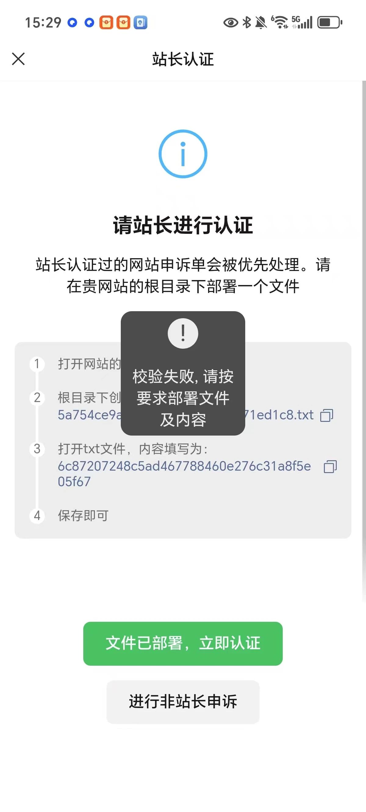 m.jmbzy.com微信打开提示“已停止访问该网页”,站点申诉一直提示“校验失败”,实际文件已经放在对应的根目录下