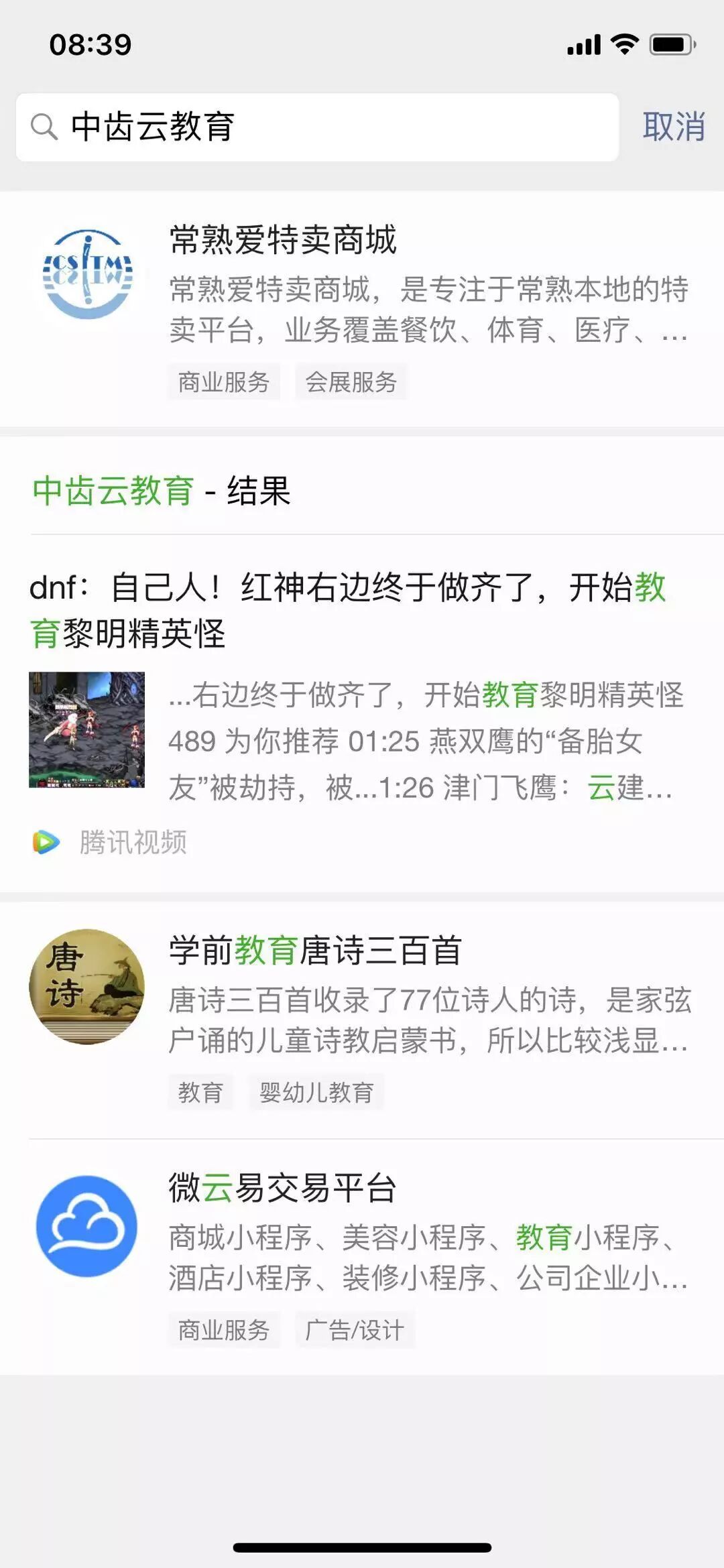 微信小程序现在审核通过,现在是ios端搜索不到“中齿云教育”,但是安卓端能够搜索到“中齿云教育”