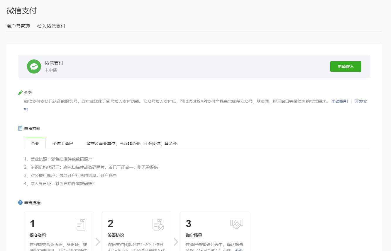你家有企业商户号没有? 直接绑定到自家的商户号更方便,就不需要开通微信支付了,多个小程序可以共用一个商户号id
