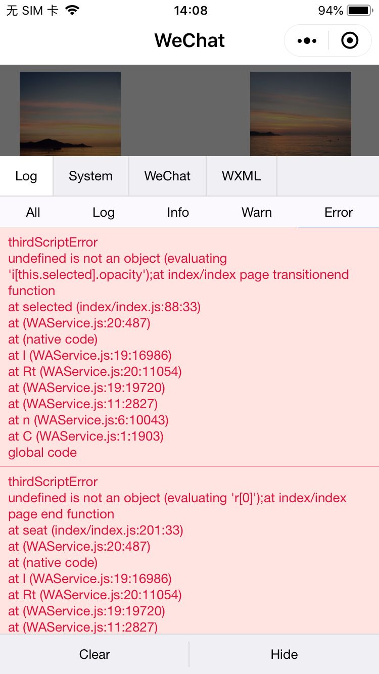 iOS上看到的是 undefined is not an object(evaluating 'r[0]') 或者 undefined is not an object(evaluating 'i[this.selected].opacity'),和PC应该是同样的错误。