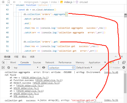 借楼求问:为什么相同环境相同数据库相同表,可以用get查询,不能用aggregate查询? 完整代码如下。报错如图:环境错误。 onLoad: function (options) { const db = wx.cloud.database() db.collection('orders').aggregate() .match({price:30}) .end() .then(res => {console.log('collection aggregate success:',res)}) .catch(err => {console.log('collection aggregate error:',err)}) db.collection('orders').get() .then(res => {console.log('collection get success:',res)}) .catch(err => {console.log('collection get error:',err)})我没有报错但是返回的却不是success函数为什么啊?我要疯了,几天了一直这样,nodejs下了,依赖安装了,云函数也反复检查了几遍。。。。。。。。死了死了。。有人教我吗?(— . —)