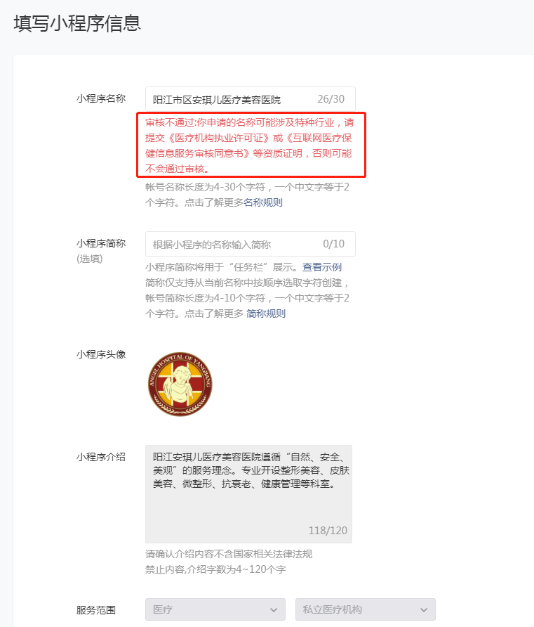 你好,贵司所设置的名称不符合规范医疗帐号命名,请按照医疗机构执业许可证的名称进行调整之后,再提交。 规范医疗帐号命名详情参考https://developers.weixin.qq.com/community/operate/doc/000680db1803980789974463d5b808