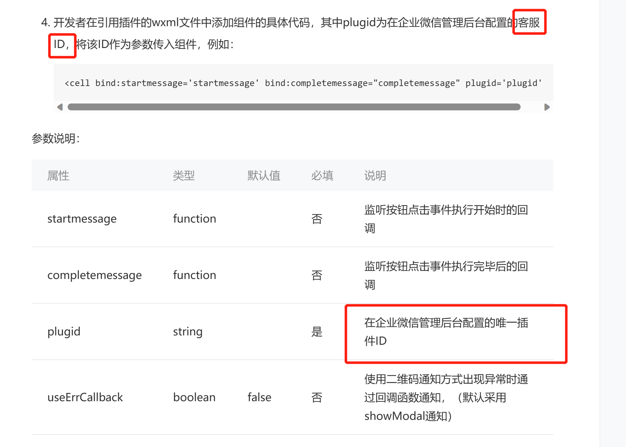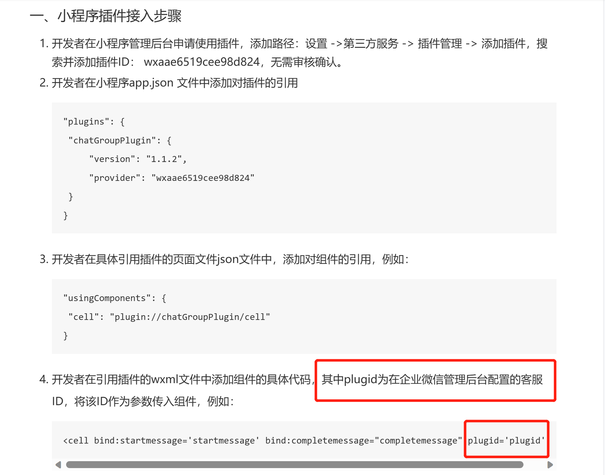 2 当前问题:文档描述,开发者在引用插件的wxml文件中添加组件的具体代码,其中plugid为在企业微信管理后台配置的客服ID,将该ID作为参数传入组件。