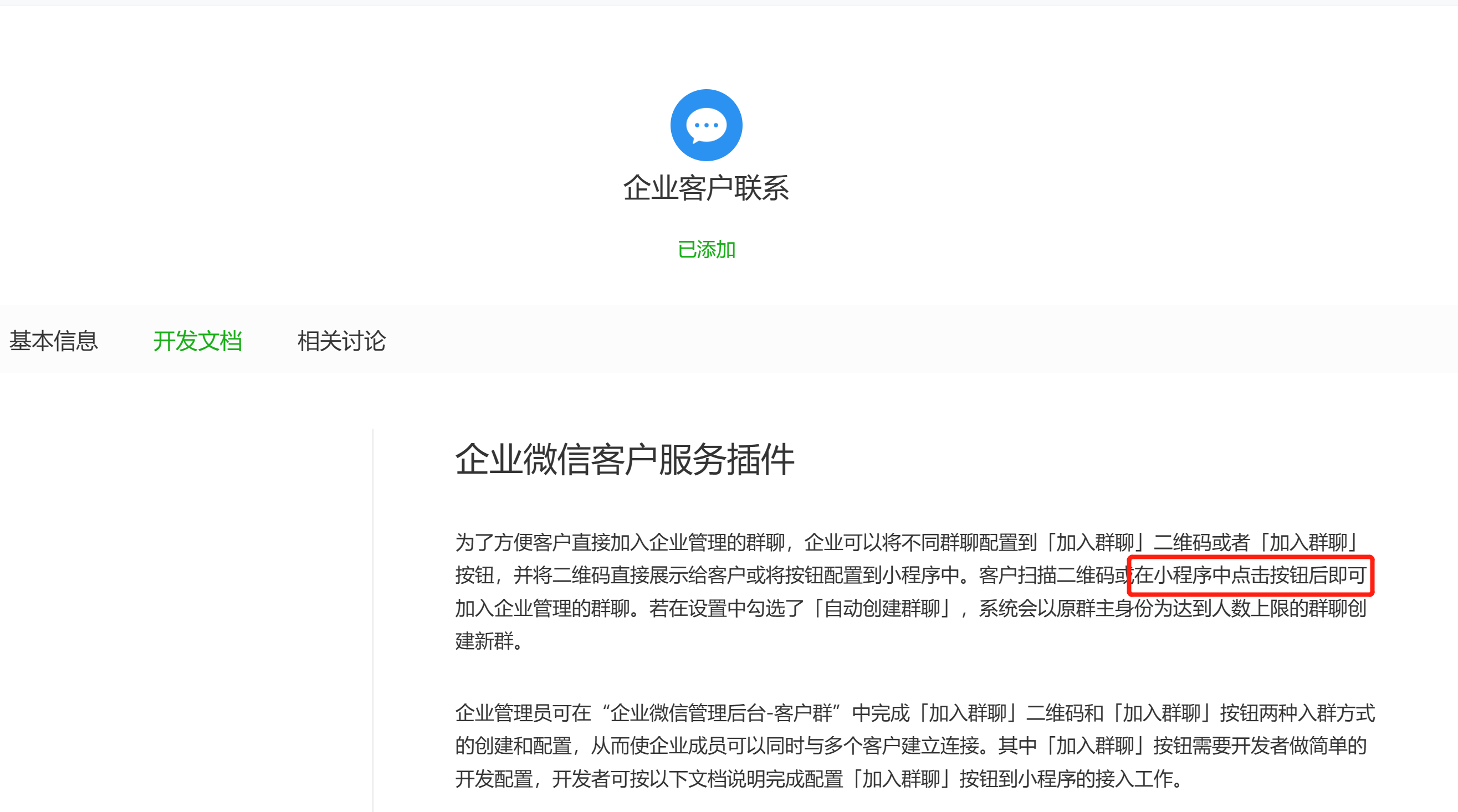 而且在企业微信后台,写明了:生成「加入群聊」按钮并配置到小程序,客户点击即可加入群聊