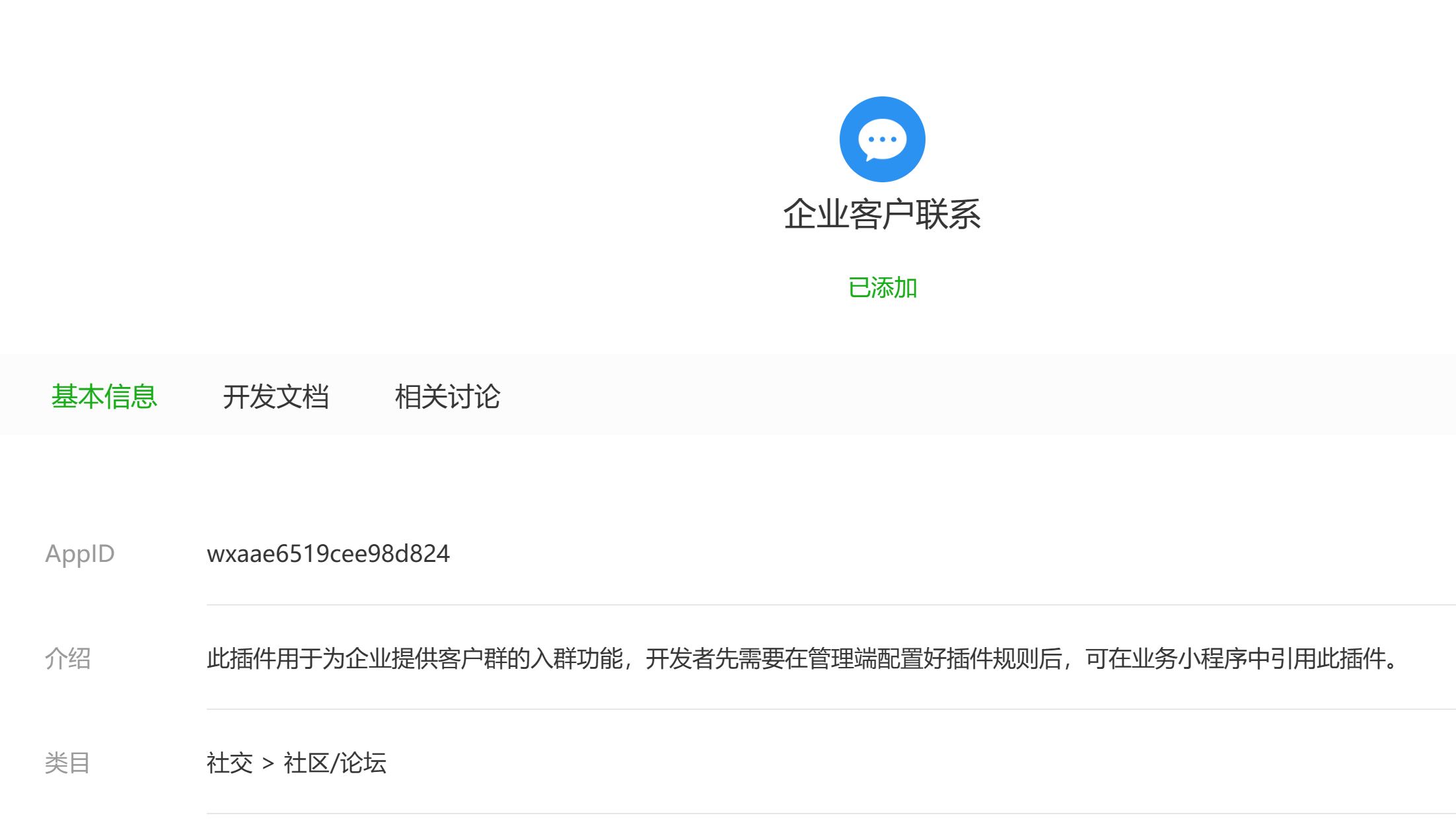 因此,根据文档描述,我需要使用组件 企业客户联系 ,ID wxaae6519cee98d824, 此插件用于为企业提供客户群的入群功能