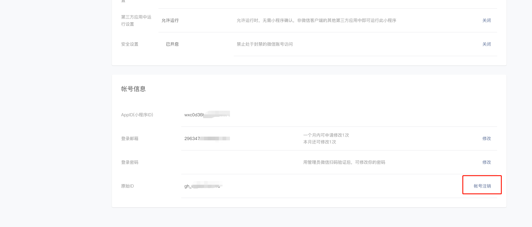 登录商家的小程序平台,点击头像,有账号注销的入口。