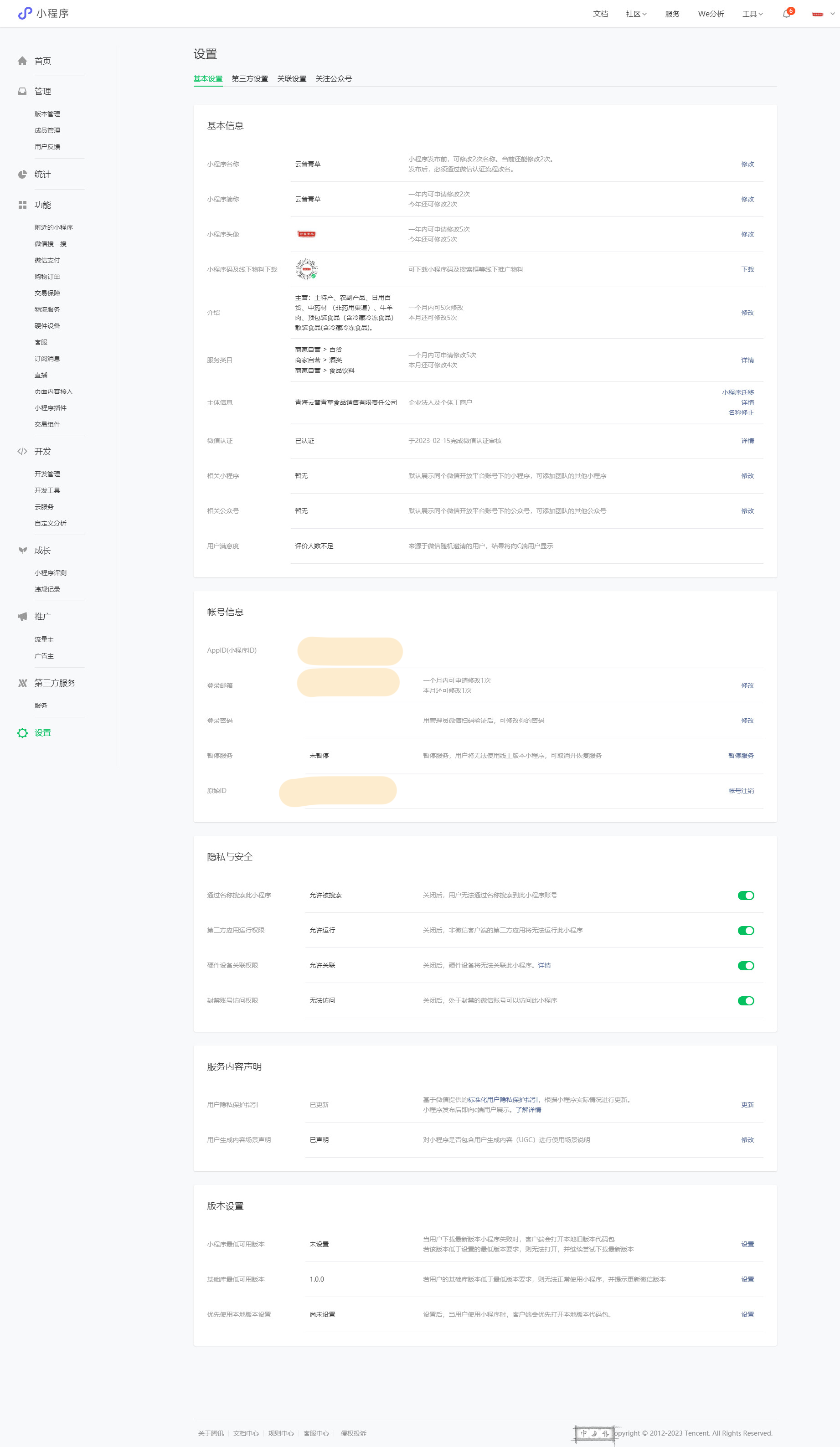 小程序管理后台 -> 设置 -> 功能设置进行 path 登记;服务内容声明里面