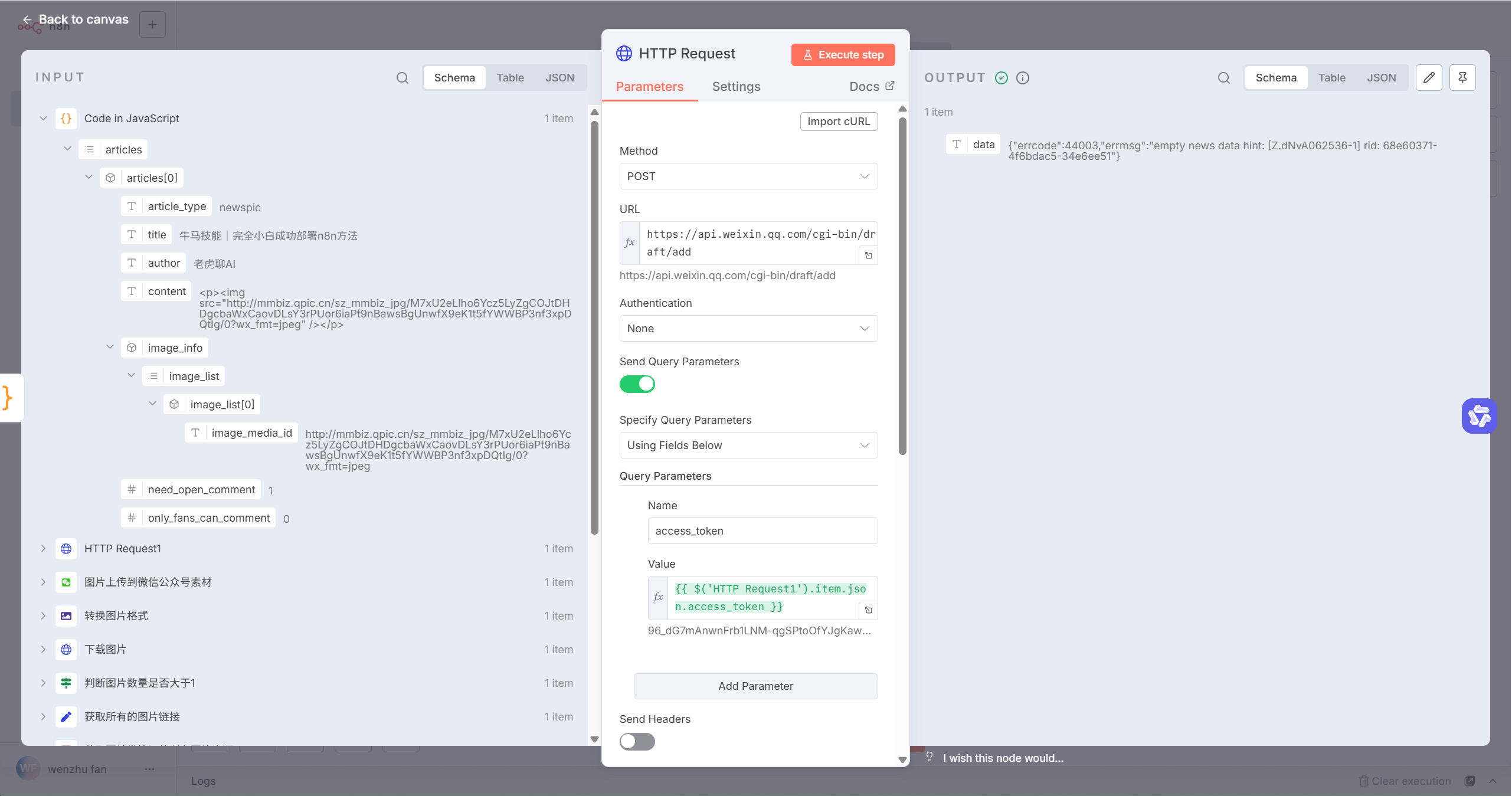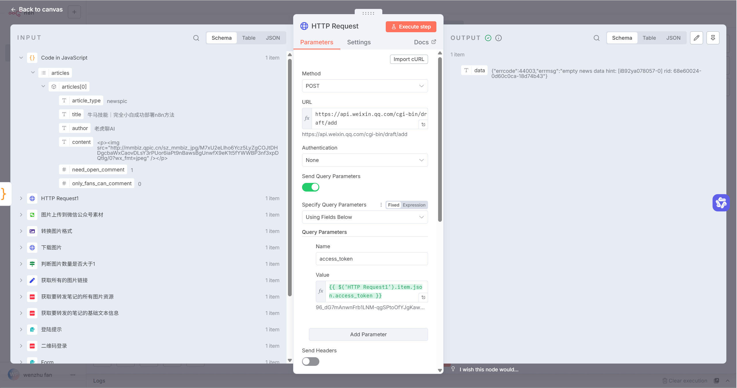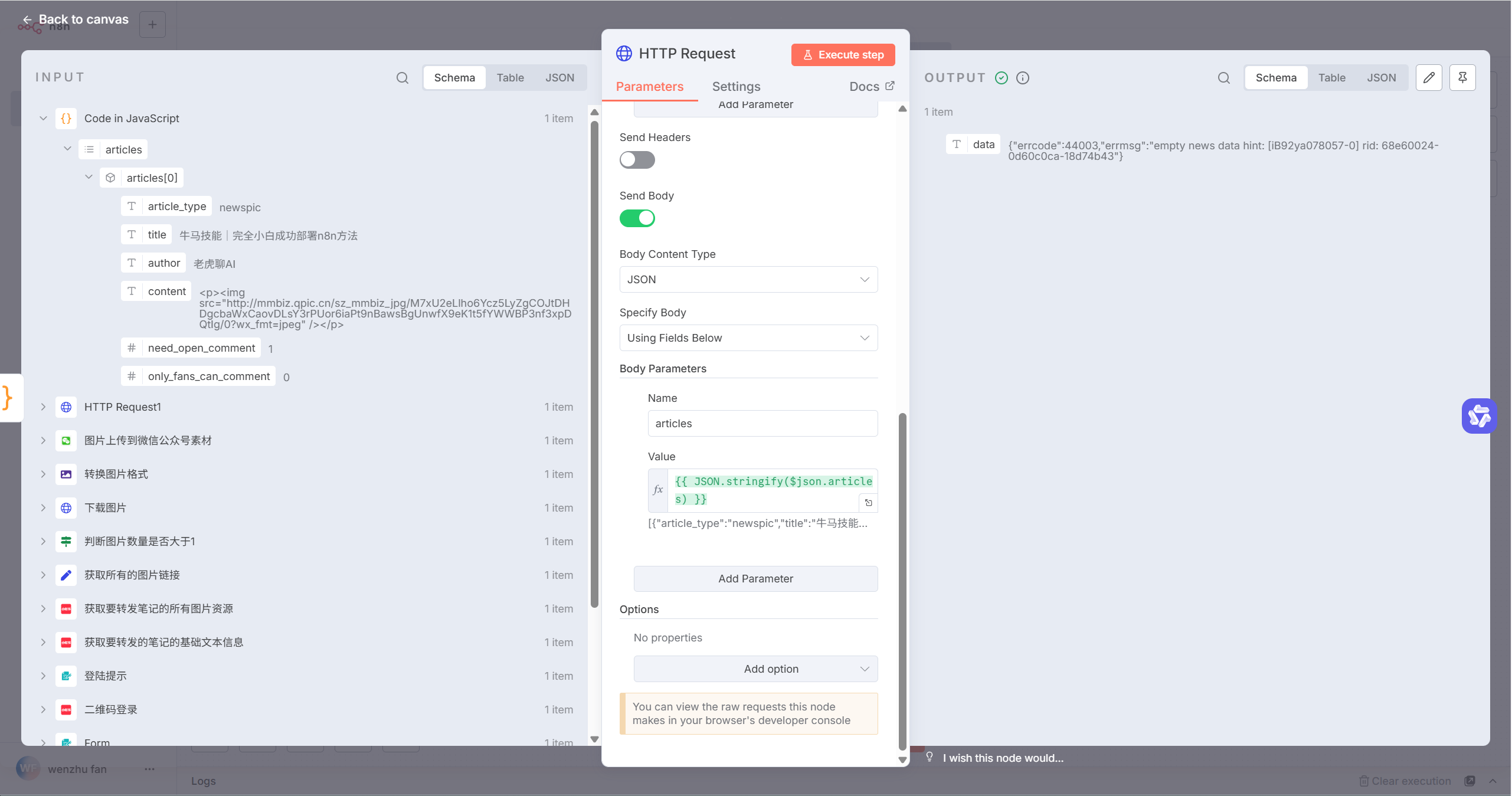 我想新建图片草稿,就是图片消息(newspic),已经根据开发文档中获取到了access token,但是在使用n8n的http request节点发送数据的过程中,不管我的articles的values如何构建,也抄过示例代码,都是报{"errcode":44003,"errmsg":"empty news data hint: [iB92ya078057-0] rid: 68e60024-0d60c0ca-18d74b43"},百思不得其解。望解答!