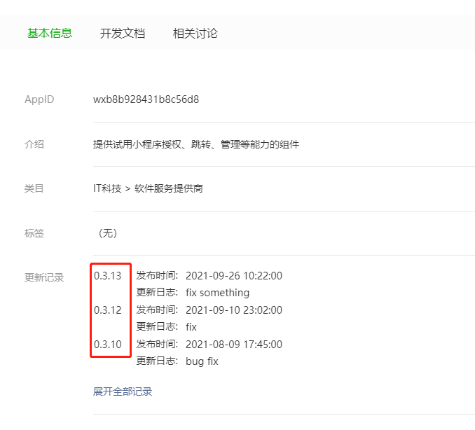 这里的插件版本号,是在那里查到的呀,文档里面是0.1.2,然后报错 MiniprogramThirdpartyPlugin.openAuthorizeAccount is not a function,换成0.3.10就好了