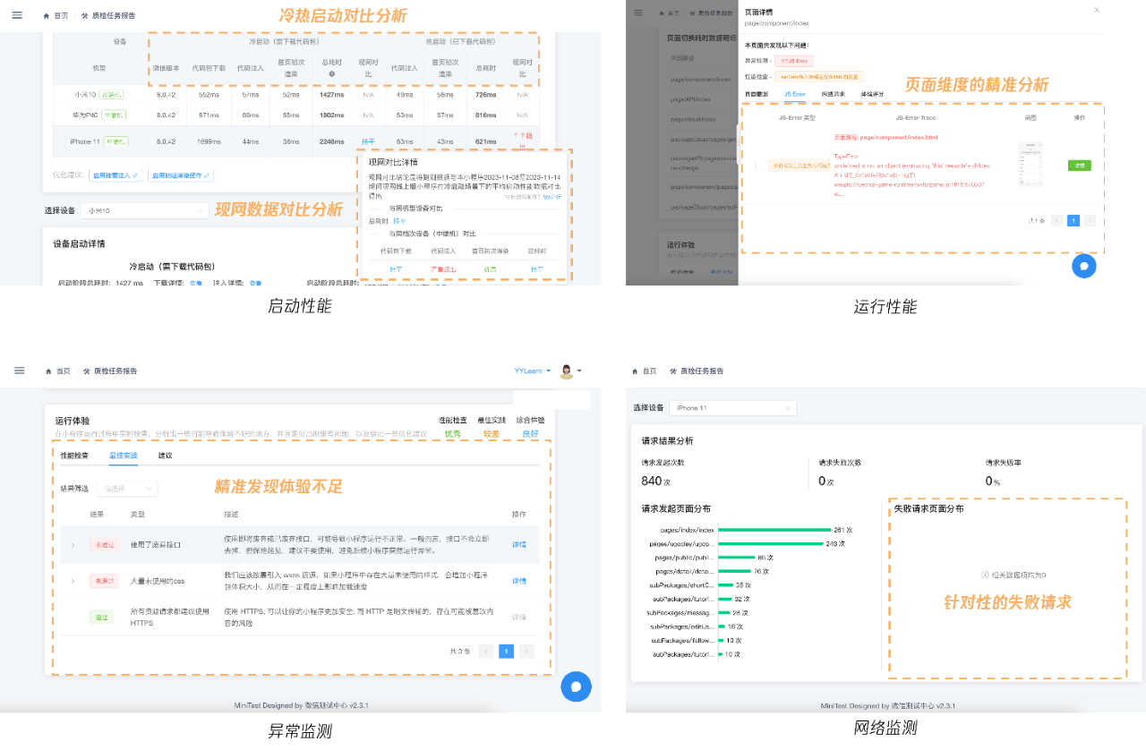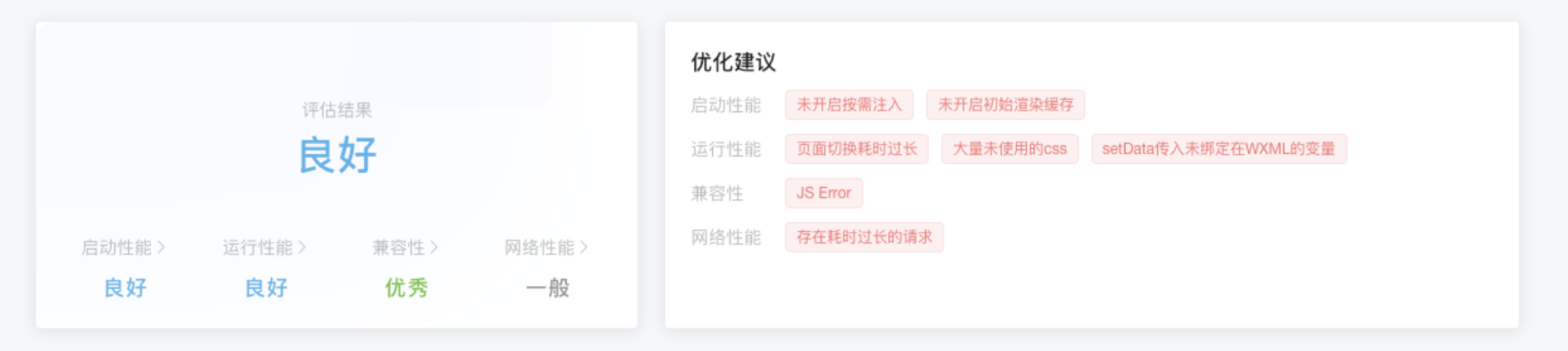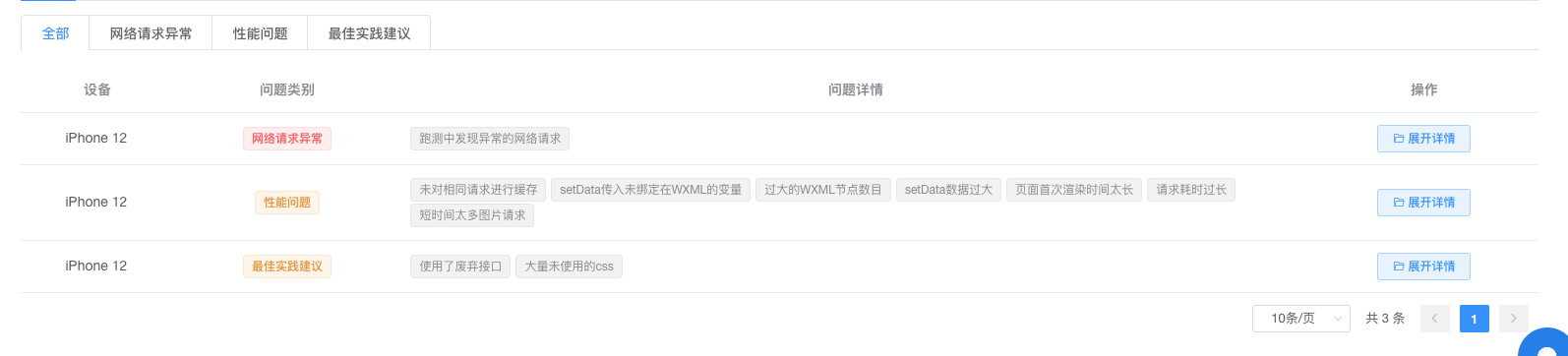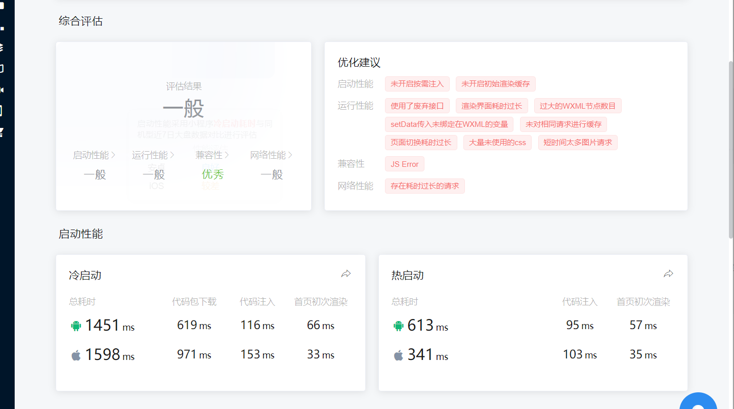 为了方便开发者快速验证版本性能表现、及时发现性能质量问题,小程序云测服务 上线 小程序质检报告,一站式查看启动性能、运行性能、异常监测、网络监测等各个环节的小程序质量问题,助力开发者提前发现潜在问题。(👉 查看 使用教程)