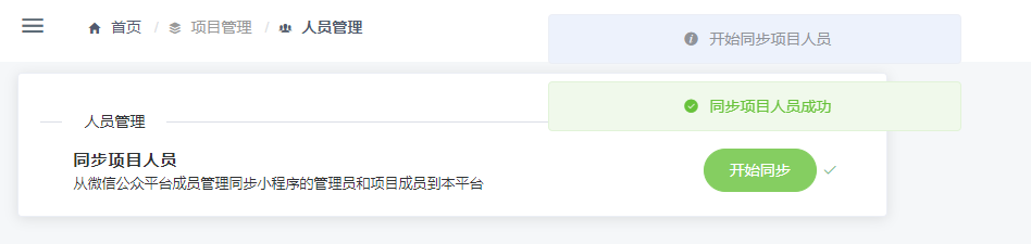 3. 同步成员是指和小程序管理后台 https://mp.weixin.qq.com 里面的成员一致。云测不做成员管理,mp平台的开发者就是项目成员。平台每天凌晨定时同步一次。如果项目在mp平台添加人员后,希望立刻同步到云测端,可以手动点下开始同步~