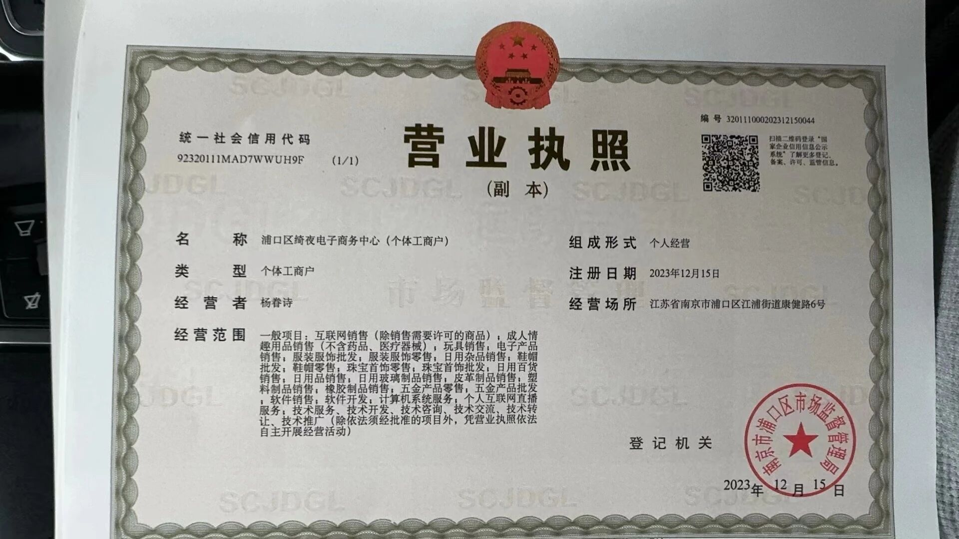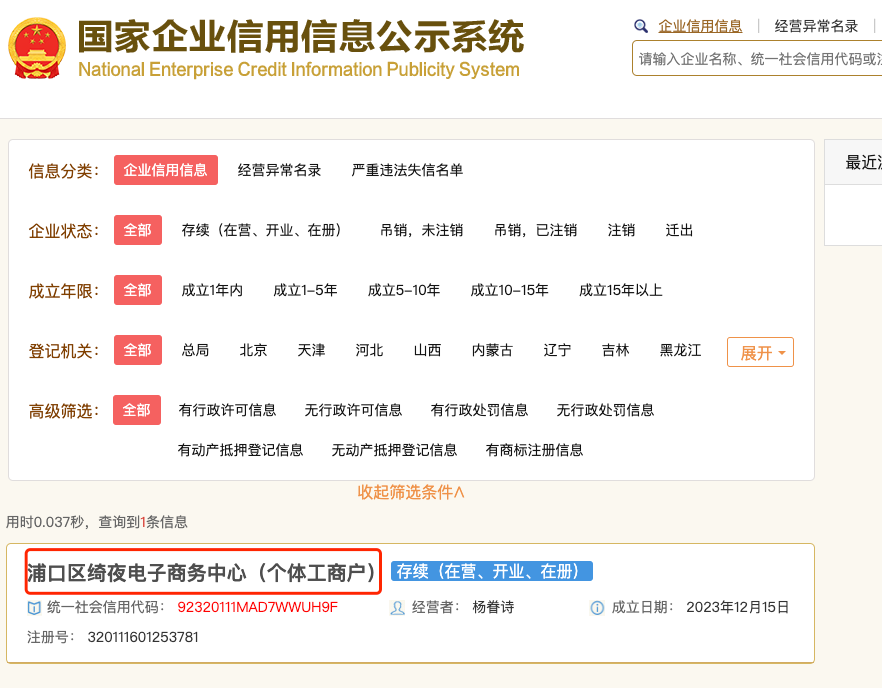 个体户名称:浦口区绮夜电子商务中心(个体工商户)