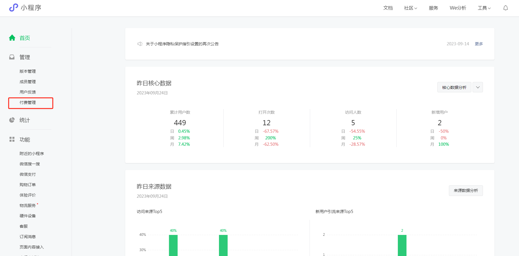 登录小程序后台(https://mp.weixin.qq.com/),左侧菜单栏付费管理进入。