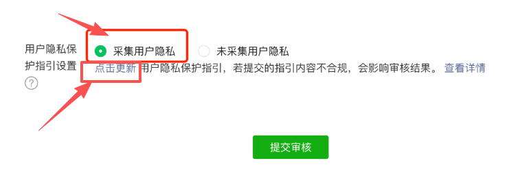 在提交审核前,有一个采集用户隐私勾选上,有一个点击更新用户隐私保护指引,确认线上已经审核通过该隐私保护指引。