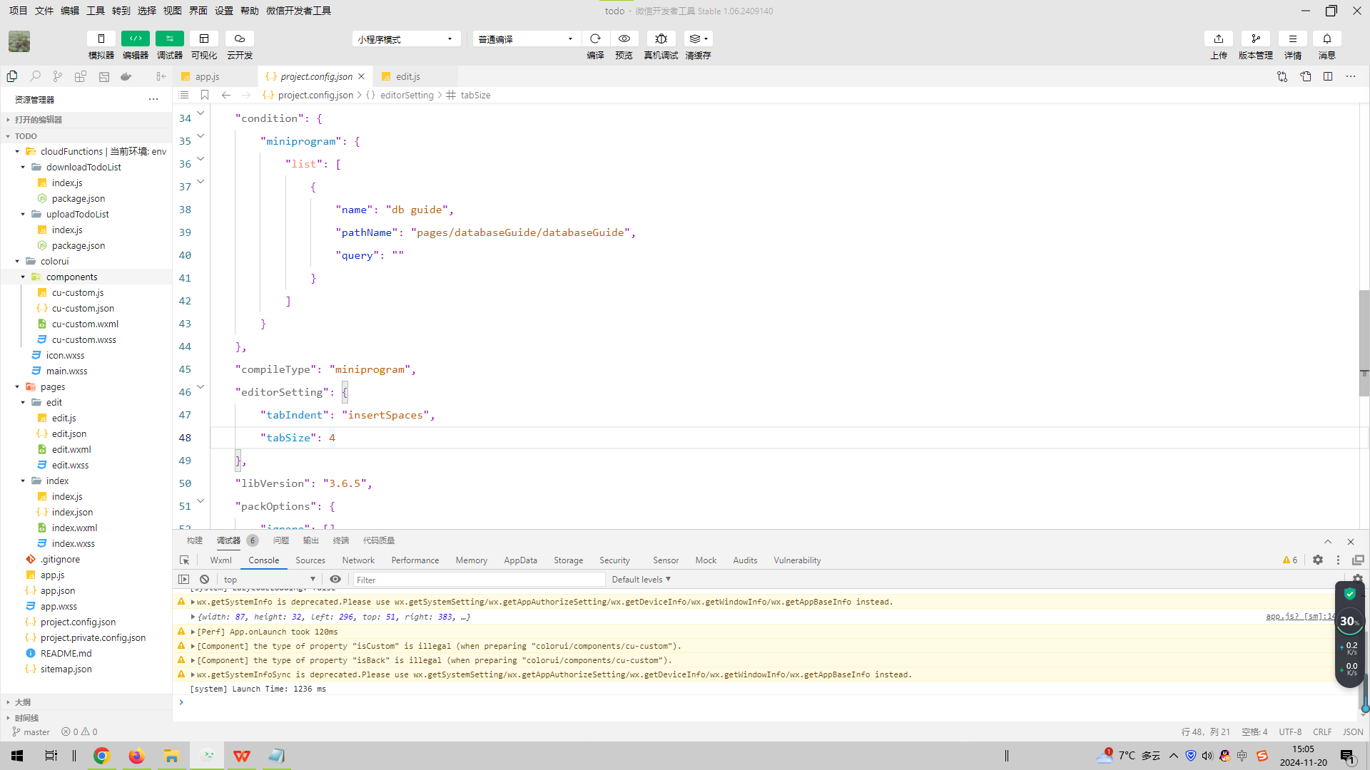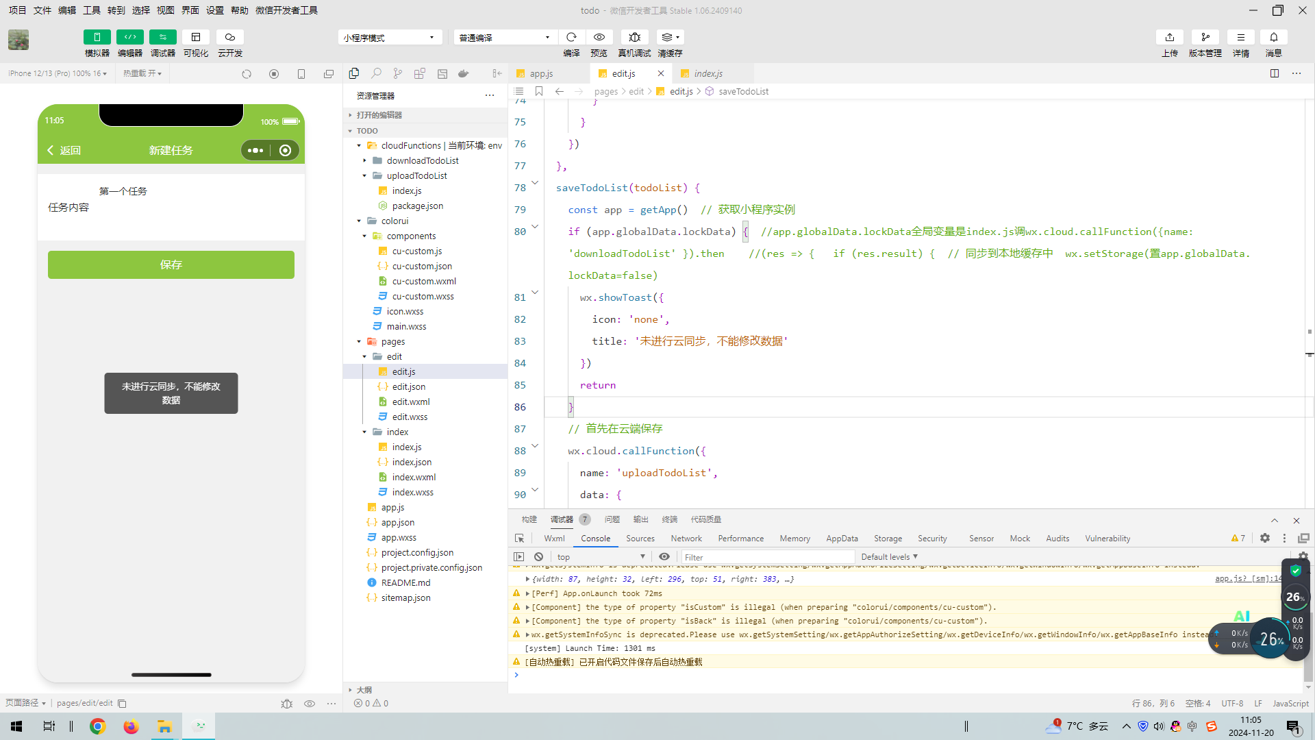 急问谢谢:项目采用任务表单形式调COLOURUI样式实现一个简单的数据库存取功能,文件结构和依赖配置见上传图片2.定义了uploadTodoList云函数、downloadTodoList云函数访问数据库,采用await云端异步上传和下载数据如: “ return await db.collection('todos').doc(wxContext.OPENID).set({。 ”云函数已上传部署,云函数云端测试通过,本地安装了node.js,但未配置本地测试,于是采用的是云端测试云函数,均能成功返回。在小程序端实现云同步:在本地缓存中更新数据的同时,也必须要向云端上传数据;在本地缓存中读取数据前,首先要向云端获取最新数据;设置全局变量lockData为true时才允许在本地修改数据。但是模拟器运行时,点击保存按钮,无法保存数据,云函数回调进入fail的提示,无法对数据库进行操作。如下图1: