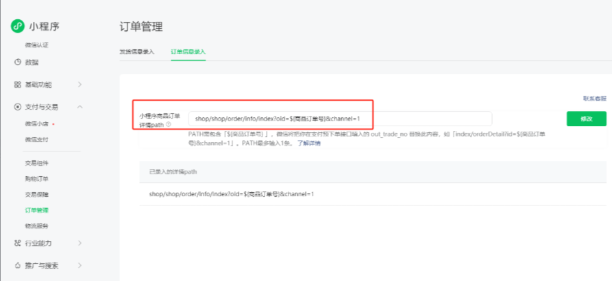 需要接入订单管理,然后登录小程序,在支付与交易-订单管理-订单信息录入,配置小程序商品订单详情PATH