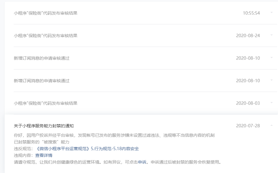 可查询7.28及8.11、8.17日期的站内信,其中8.11和8.17后台反馈该小程序未对违法、违规、政治敏感等不当信息内容进行安全过滤,存在信息内容安全问题。需要进行整改后进行申诉解封
